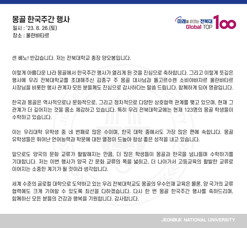 센 베노! 반갑습니다. 저는 전북대학교 총장 양오봉입니다. 이렇게 아름다운 나라 몽골에서 한국주간 행사가 열리게 된 것을 진심으로 축하합니다. 그리고 이렇게 뜻깊은 행사에 우리 전북대학교를 초대해주신 김종구 주 몽골 대사님과 돌고르수렌 소비야바자르 울란바타르 시장님을 비롯한 행사 관계자 모든 분들께도 진심으로 감사하다는 말씀 드립니다. 함께하게 되어 영광입니다. 한국과 몽골은 역사적으로나 문화적으로, 그리고 정치적으로 다양한 상호협력 관계를 맺고 있으며, 현재 그 관계가 더 깊어지는 것을 몸소 체감하고 있습니다. 특히 우리 전북대학교에는 현재 123명의 몽골 학생들이 수학하고 있습니다. 이는 우리대학 유학생 중 네 번째로 많은 수이며, 한국 대학 중에서도 가장 많은 편에 속합니다. 몽골 유학생들은 뛰어난 언어능력과 학문에 대한 열정이 드높아 항상 좋은 성적을 내고 있습니다. 앞으로도 양국의 문화 교류가 활발해지는 만큼, 더 많은 학생들이 몽골과 한국을 넘나들며 수학하기를 기대합니다. 저는 이번 행사가 양국 간 문화 교류의 폭을 넓히고, 더 나아가서 고등교육의 활발한 교류로 이어지는 소중한 계기가 될 것이라 생각합니다. 세계 수준의 글로컬 대학으로 도약하고 있는 우리 전북대학교도 몽골의 우수인재 교육은 물론, 양 국가의 교류 협력에도 크게 기여할 수 있도록 최선을 다하겠습니다. 다시 한 번 몽골 한국주간 행사를 축하드리며, 함께하신 모든 분들의 건강과 행복을 기원합니다. 감사합니다.