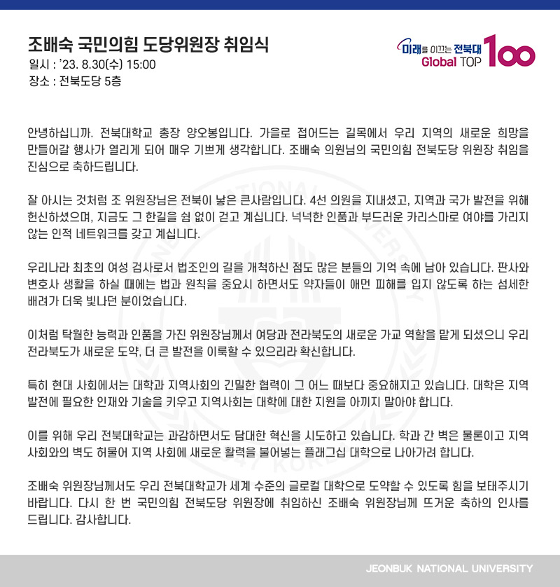 안녕하십니까. 전북대학교 총장 양오봉입니다. 가을로 접어드는 길목에서 우리 지역의 새로운 희망을 만들어갈 행사가 열리게 되어 매우 기쁘게 생각합니다. 조배숙 의원님의 국민의힘 전북도당 위원장 취임을 진심으로 축하드립니다. 잘 아시는 것처럼 조 위원장님은 전북이 낳은 큰사람입니다. 4선 의원을 지내셨고, 지역과 국가 발전을 위해 헌신하셨으며, 지금도 그 한길을 쉼 없이 걷고 계십니다. 넉넉한 인품과 부드러운 카리스마로 여야를 가리지 않는 인적 네트워크를 갖고 계십니다. 우리나라 최초의 여성 검사로서 법조인의 길을 개척하신 점도 많은 분들의 기억 속에 남아 있습니다. 판사와 변호사 생활을 하실 때에는 법과 원칙을 중요시 하면서도 약자들이 애먼 피해를 입지 않도록 하는 섬세한 배려가 더욱 빛나던 분이었습니다. 이처럼 탁월한 능력과 인품을 가진 위원장님께서 여당과 전라북도의 새로운 가교 역할을 맡게 되셨으니 우리 전라북도가 새로운 도약, 더 큰 발전을 이룩할 수 있으리라 확신합니다. 특히 현대 사회에서는 대학과 지역사회의 긴밀한 협력이 그 어느 때보다 중요해지고 있습니다. 대학은 지역 발전에 필요한 인재와 기술을 키우고 지역사회는 대학에 대한 지원을 아끼지 말아야 합니다. 이를 위해 우리 전북대학교는 과감하면서도 담대한 혁신을 시도하고 있습니다. 학과 간 벽은 물론이고 지역 사회와의 벽도 허물어 지역 사회에 새로운 활력을 불어넣는 플래그십 대학으로 나아가려 합니다. 조배숙 위원장님께서도 우리 전북대학교가 세계 수준의 글로컬 대학으로 도약할 수 있도록 힘을 보태주시기 바랍니다. 다시 한 번 국민의힘 전북도당 위원장에 취임하신 조배숙 위원장님께 뜨거운 축하의 인사를 드립니다. 감사합니다.