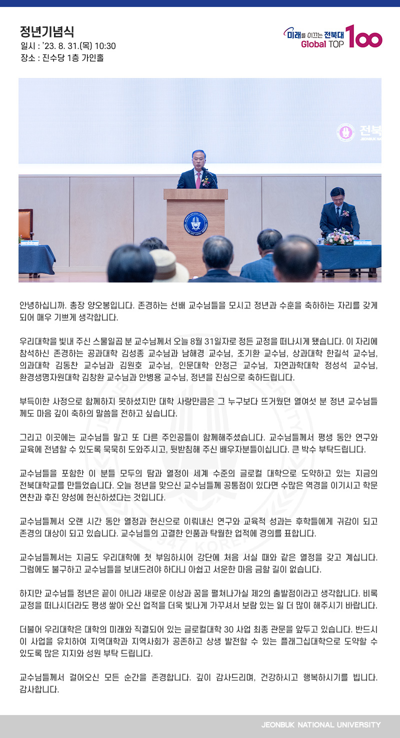 우리대학을 빛내 주신 스물일곱 분 교수님께서 오늘 8월 31일자로 정든 교정을 떠나시게 됐습니다. 이 자리에 참석하신 존경하는 공과대학 김성종 교수님과 남해경 교수님, 조기환 교수님, 상과대학 한길석 교수님, 의과대학 김동찬 교수님과 김원호 교수님, 인문대학 안정근 교수님, 자연과학대학 정성석 교수님, 환경생명자원대학 김창환 교수님과 안병용 교수님, 정년을 진심으로 축하드립니다.