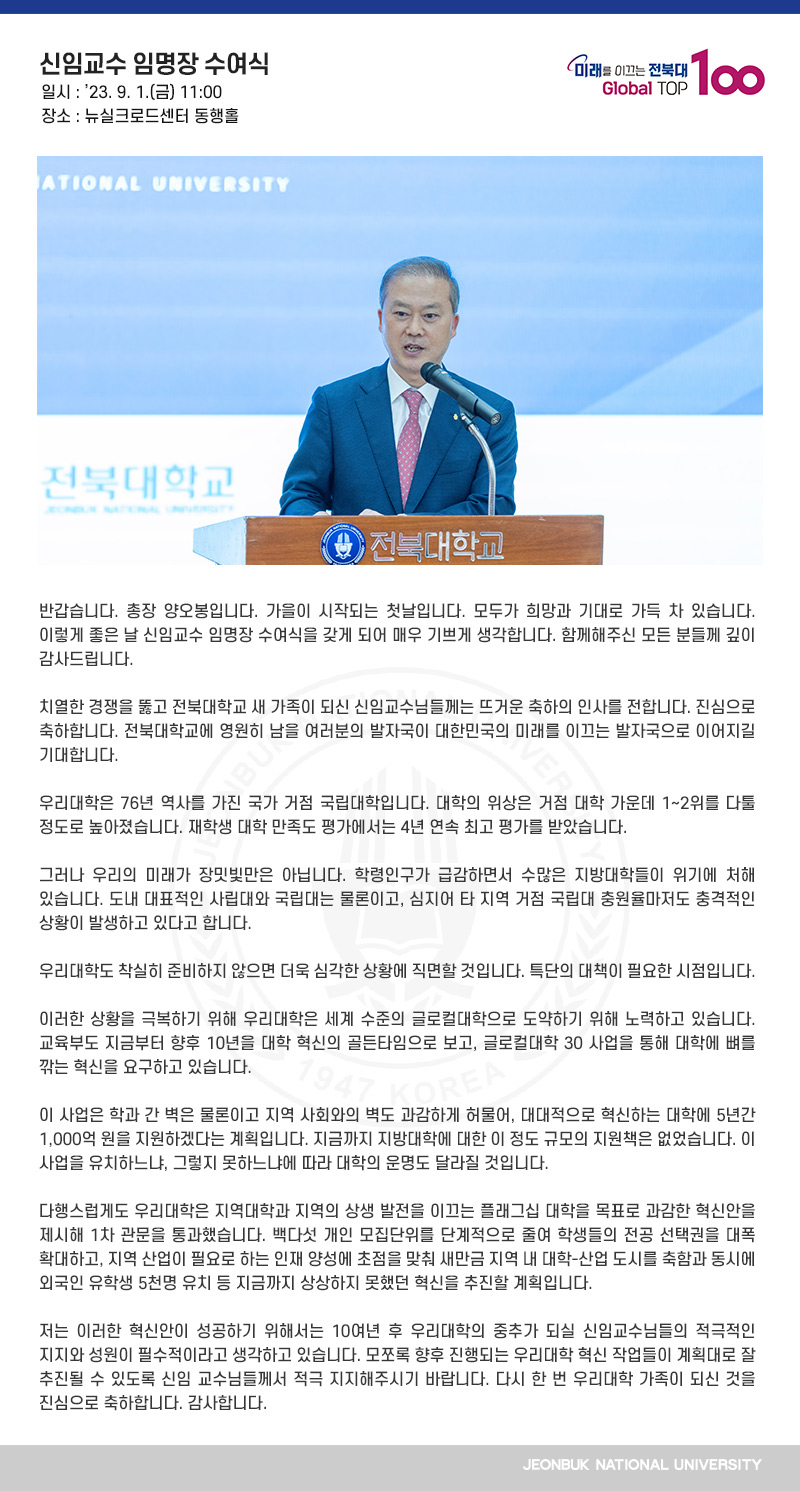반갑습니다. 총장 양오봉입니다. 가을이 시작되는 첫날입니다. 모두가 희망과 기대로 가득 차 있습니다. 이렇게 좋은 날 신임교수 임명장 수여식을 갖게 되어 매우 기쁘게 생각합니다. 함께해주신 모든 분들께 깊이 감사드립니다. 치열한 경쟁을 뚫고 전북대학교 새 가족이 되신 신임교수님들께는 뜨거운 축하의 인사를 전합니다. 진심으로 축하합니다. 전북대학교에 영원히 남을 여러분의 발자국이 대한민국의 미래를 이끄는 발자국으로 이어지길 기대합니다. 우리대학은 76년 역사를 가진 국가 거점 국립대학입니다. 대학의 위상은 거점 대학 가운데 1~2위를 다툴 정도로 높아졌습니다. 재학생 대학 만족도 평가에서는 4년 연속 최고 평가를 받았습니다. 그러나 우리의 미래가 장밋빛만은 아닙니다. 학령인구가 급감하면서 수많은 지방대학들이 위기에 처해 있습니다. 도내 대표적인 사립대와 국립대는 물론이고, 심지어 타 지역 거점 국립대 충원율마저도 충격적인 상황이 발생하고 있다고 합니다. 우리대학도 착실히 준비하지 않으면 더욱 심각한 상황에 직면할 것입니다. 특단의 대책이 필요한 시점입니다. 이러한 상황을 극복하기 위해 우리대학은 세계 수준의 글로컬대학으로 도약하기 위해 노력하고 있습니다. 교육부도 지금부터 향후 10년을 대학 혁신의 골든타임으로 보고, 글로컬대학 30 사업을 통해 대학에 뼈를 깎는 혁신을 요구하고 있습니다. 이 사업은 학과 간 벽은 물론이고 지역 사회와의 벽도 과감하게 허물어, 대대적으로 혁신하는 대학에 5년간 1,000억 원을 지원하겠다는 계획입니다. 지금까지 지방대학에 대한 이 정도 규모의 지원책은 없었습니다. 이 사업을 유치하느냐, 그렇지 못하느냐에 따라 대학의 운명도 달라질 것입니다. 다행스럽게도 우리대학은 지역대학과 지역의 상생 발전을 이끄는 플래그십 대학을 목표로 과감한 혁신안을 제시해 1차 관문을 통과했습니다. 백다섯 개인 모집단위를 단계적으로 줄여 학생들의 전공 선택권을 대폭 확대하고, 지역 산업이 필요로 하는 인재 양성에 초점을 맞춰 새만금 지역 내 대학-산업 도시를 축함과 동시에 외국인 유학생 5천명 유치 등 지금까지 상상하지 못했던 혁신을 추진할 계획입니다. 저는 이러한 혁신안이 성공하기 위해서는 10여년 후 우리대학의 중추가 되실 신임교수님들의 적극적인 지지와 성원이 필수적이라고 생각하고 있습니다. 모쪼록 향후 진행되는 우리대학 혁신 작업들이 계획대로 잘 추진될 수 있도록 신임 교수님들께서 적극 지지해주시기 바랍니다. 다시 한 번 우리대학 가족이 되신 것을 진심으로 축하합니다. 감사합니다.