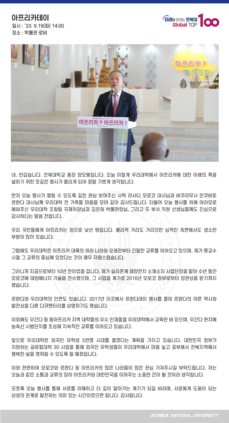 네, 반갑습니다. 전북대학교 총장 양오봉입니다. 오늘 이렇게 우리대학에서 아프리카에 대한 이해의 폭을 넓히기 위한 뜻깊은 행사가 열리게 되어 정말 기쁘게 생각합니다.
