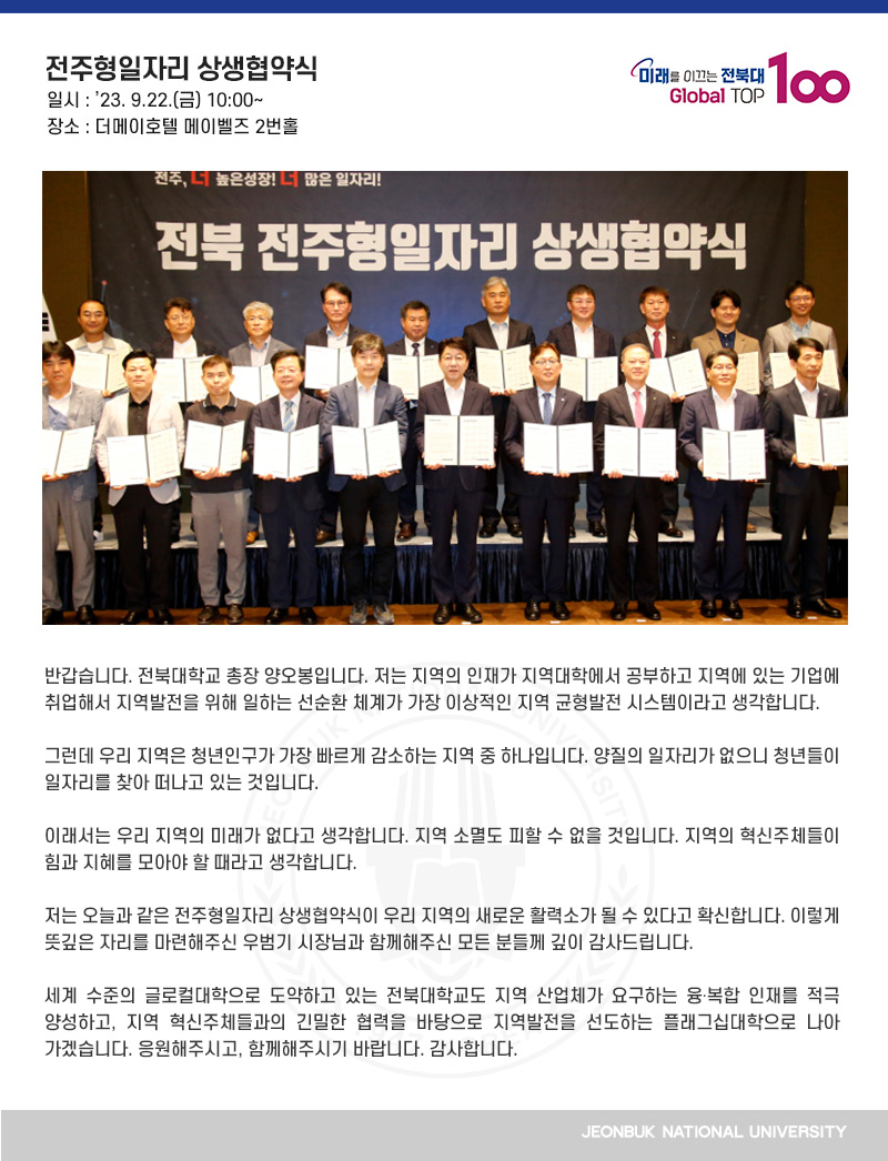 세계 수준의 글로컬대학으로 도약하고 있는 전북대학교도 지역 산업체가 요구하는 융․복합 인재를 적극 양성하고, 지역 혁신주체들과의 긴밀한 협력을 바탕으로 지역발전을 선도하는 플래그십대학으로 나아가겠습니다. 응원해주시고, 함께해주시기 바랍니다. 감사합니다.