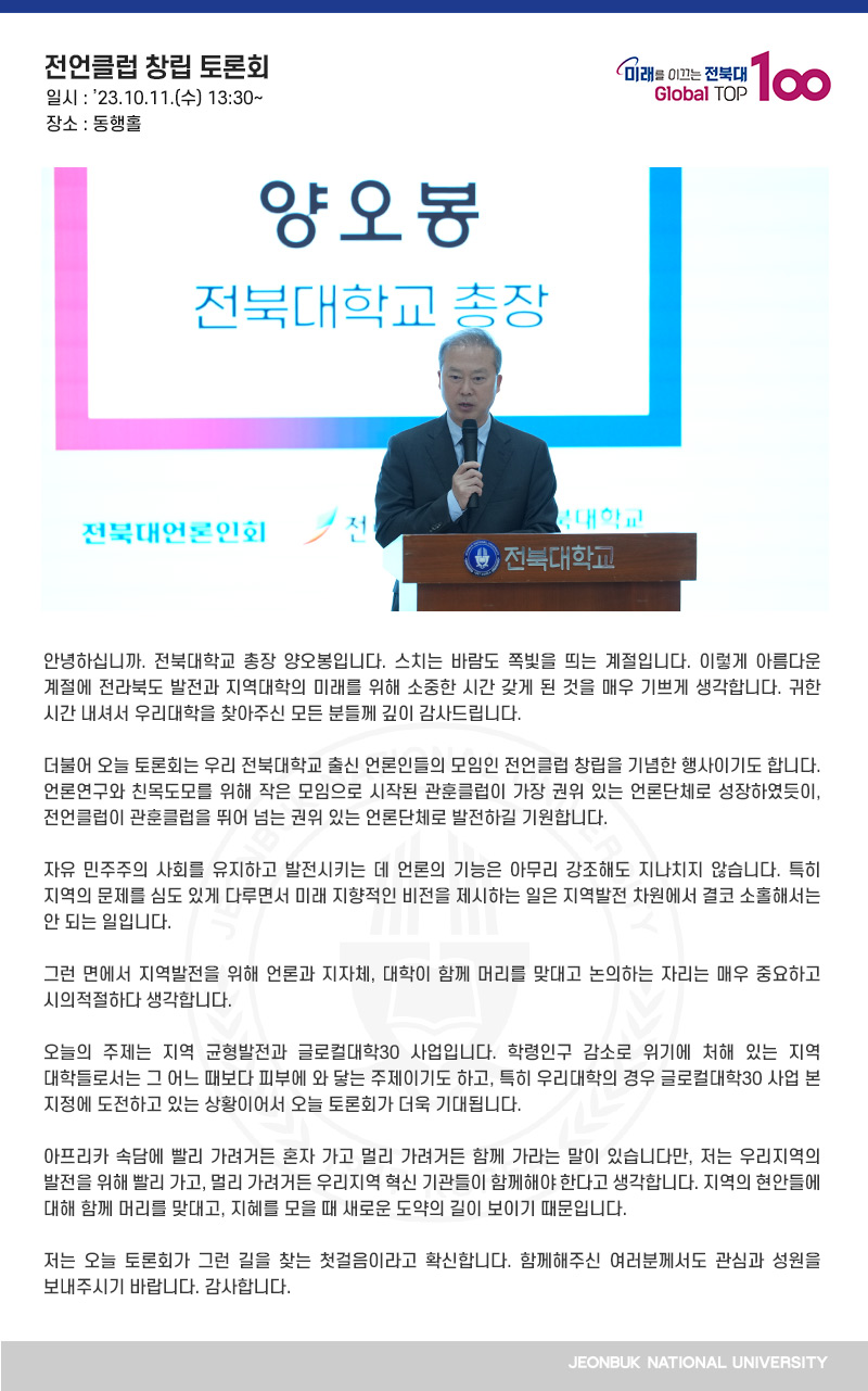안녕하십니까. 전북대학교 총장 양오봉입니다. 스치는 바람도 쪽빛을 띄는 계절입니다. 이렇게 아름다운 계절에 전라북도 발전과 지역대학의 미래를 위해 소중한 시간 갖게 된 것을 매우 기쁘게 생각합니다. 귀한 시간 내셔서 우리대학을 찾아주신 모든 분들께 깊이 감사드립니다. 더불어 오늘 토론회는 우리 전북대학교 출신 언론인들의 모임인 전언클럽 창립을 기념한 행사이기도 합니다. 언론연구와 친목도모를 위해 작은 모임으로 시작된 관훈클럽이 가장 권위 있는 언론단체로 성장하였듯이, 전언클럽이 관훈클럽을 뛰어 넘는 권위 있는 언론단체로 발전하길 기원합니다. 자유 민주주의 사회를 유지하고 발전시키는 데 언론의 기능은 아무리 강조해도 지나치지 않습니다. 특히 지역의 문제를 심도 있게 다루면서 미래 지향적인 비전을 제시하는 일은 지역발전 차원에서 결코 소홀해서는 안 되는 일입니다. 그런 면에서 지역발전을 위해 언론과 지자체, 대학이 함께 머리를 맞대고 논의하는 자리는 매우 중요하고 시의적절하다 생각합니다. 오늘의 주제는 지역 균형발전과 글로컬대학30 사업입니다. 학령인구 감소로 위기에 처해 있는 지역 대학들로서는 그 어느 때보다 피부에 와 닿는 주제이기도 하고, 특히 우리대학의 경우 글로컬대학30 사업 본 지정에 도전하고 있는 상황이어서 오늘 토론회가 더욱 기대됩니다. 아프리카 속담에 빨리 가려거든 혼자 가고 멀리 가려거든 함께 가라는 말이 있습니다만, 저는 우리지역의 발전을 위해 빨리 가고, 멀리 가려거든 우리지역 혁신 기관들이 함께해야 한다고 생각합니다. 지역의 현안들에 대해 함께 머리를 맞대고, 지혜를 모을 때 새로운 도약의 길이 보이기 때문입니다. 저는 오늘 토론회가 그런 길을 찾는 첫걸음이라고 확신합니다. 함께해주신 여러분께서도 관심과 성원을 보내주시기 바랍니다. 감사합니다.
