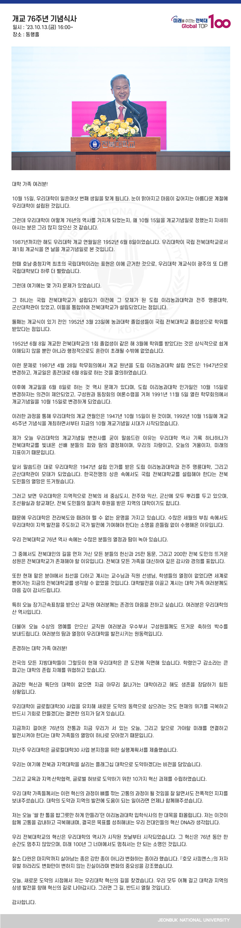 대학 가족 여러분! 10월 15일, 우리대학이 일흔여섯 번째 생일을 맞게 됩니다. 눈이 맑아지고 마음이 깊어지는 아름다운 계절에 우리대학이 설립된 것입니다. 그런데 우리대학이 어떻게 76년의 역사를 가지게 되었는지, 왜 10월 15일을 개교기념일로 정했는지 자세히 아시는 분은 그리 많지 않으신 것 같습니다. 1987년까지만 해도 우리대학 개교 연월일은 1952년 6월 8일이었습니다. 우리대학이 국립 전북대학교로서 제1회 개교식을 연 날을 개교기념일로 본 것입니다. 한때 호남․충청지역 최초의 국립대학이라는 표현은 이에 근거한 것으로, 우리대학 개교식이 광주의 또 다른 국립대학보다 하루 더 빨랐습니다. 그런데 여기에는 몇 가지 문제가 있었습니다. 그 하나는 국립 전북대학교가 설립되기 이전에 그 모체가 된 도립 이리농과대학과 전주 명륜대학, 군산대학관이 있었고, 이들을 통합하여 전북대학교가 설립되었다는 점입니다. 둘째는 개교식이 있기 전인 1952년 3월 23일에 농과대학 졸업생들이 국립 전북대학교 졸업생으로 학위를 받았다는 점입니다. 1952년 6월 8일 개교한 전북대학교의 1회 졸업생이 같은 해 3월에 학위를 받았다는 것은 상식적으로 쉽게 이해되지 않을 뿐만 아니라 행정적으로도 혼란이 초래될 수밖에 없었습니다. 이런 문제로 1987년 4월 28일 학무회의에서 개교 원년을 도립 이리농과대학 설립 연도인 1947년으로 변경하고, 개교일은 종전대로 6월 8일로 하는 것을 결의하였습니다. 이후에 개교일을 6월 8일로 하는 것 역시 문제가 있다며, 도립 이리농과대학 인가일인 10월 15일로 변경하자는 의견이 제안되었고, 구성원과 동창회의 여론수렴을 거쳐 1991년 11월 5일 열린 학무회의에서 개교기념일을 10월 15일로 변경하게 되었습니다. 이러한 과정을 통해 우리대학의 개교 연월인은 1947년 10월 15일이 된 것이며, 1992년 10월 15일에 개교 45주년 기념식을 개최하면서부터 지금의 10월 개교기념일 시대가 시작되었습니다. 제가 오늘 우리대학의 개교기념일 변천사를 굳이 말씀드린 이유는 우리대학 역사 기록 하나하나가 전북대학교를 빛내온 선배 분들의 피와 땀의 결정체이며, 우리의 자랑이고, 오늘의 거울이자, 미래의 지표이기 때문입니다. 앞서 말씀드린 대로 우리대학은 1947년 설립 인가를 받은 도립 이리농과대학과 전주 명륜대학, 그리고 군산대학관이 모태가 되었습니다. 한국전쟁의 상흔 속에서도 국립 전북대학교를 설립해야 한다는 전북 도민들의 열망은 뜨거웠습니다. 그러고 보면 우리대학은 지역적으로 전북의 세 중심도시, 전주와 익산, 군산에 모두 뿌리를 두고 있으며, 조선황실과 향교재단, 전북 도민들의 절대적 후원을 받은 지역의 대학이기도 합니다. 때문에 우리대학은 전라북도와 떼려야 뗄 수 없는 운명을 가지고 있습니다. 수많은 세월의 부침 속에서도 우리대학이 지역 발전을 주도하고 국가 발전에 기여해야 한다는 소명을 흔들림 없이 수행해온 이유입니다. 우리 전북대학교 76년 역사 속에는 수많은 분들의 열정과 땀이 녹아 있습니다. 그 중에서도 전북대인의 길을 먼저 가신 모든 분들의 헌신과 25만 동문, 그리고 200만 전북 도민의 뜨거운 성원은 전북대학교가 존재해야 할 이유입니다. 전북대 모든 가족을 대신하여 깊은 감사와 경의를 표합니다. 또한 현재 맡은 분야에서 최선을 다하고 계시는 교수님과 직원 선생님, 학생들의 열정이 없었다면 세계로 뻗어가는 지금의 전북대학교를 생각할 수 없었을 것입니다. 대학발전을 이끌고 계시는 대학 가족 여러분께도 마음 깊이 감사드립니다. 특히 오늘 장기근속표창을 받으신 교직원 여러분께는 존경의 마음을 전하고 싶습니다. 여러분은 우리대학의 산 역사입니다. 더불어 오늘 수상의 영예를 안으신 교직원 여러분과 우수부서 구성원들께도 뜨거운 축하의 박수를 보내드립니다. 여러분의 땀과 열정이 우리대학을 발전시키는 원동력입니다. 존경하는 대학 가족 여러분! 전국의 모든 지방대학들이 그렇듯이 현재 우리대학은 큰 도전에 직면해 있습니다. 학령인구 감소라는 큰 파고는 대학의 존립 자체를 위협하고 있습니다. 과감한 혁신과 특단의 대책이 없으면 지금 아무리 잘나가는 대학이라고 해도 생존을 장담하기 힘든 상황입니다. 우리대학이 글로컬대학30 사업을 유치해 새로운 도약의 동력으로 삼으려는 것도 현재의 위기를 극복하고 반드시 기회로 만들겠다는 결연한 의지가 담겨 있습니다. 지금까지 걸어온 76년의 전통과 지금 우리가 서 있는 오늘, 그리고 앞으로 가야할 미래를 연결하고 발전시켜야 한다는 대학 가족들의 열망이 하나로 모아졌기 때문입니다. 지난주 우리대학은 글로컬대학30 사업 본지정을 위한 실행계획서를 제출했습니다. 우리는 여기에 전북과 지역대학을 살리는 플래그십 대학으로 도약하겠다는 비전을 담았습니다. 그리고 교육과 지역․산학협력, 글로벌 허브로 도약하기 위한 10가지 혁신 과제를 수립하였습니다. 우리 대학 가족들께서는 이런 혁신의 과정이 뼈를 깎는 고통의 과정이 될 것임을 잘 알면서도 전폭적인 지지를 보내주셨습니다. 대학의 도약과 지역의 발전에 도움이 되는 일이라면