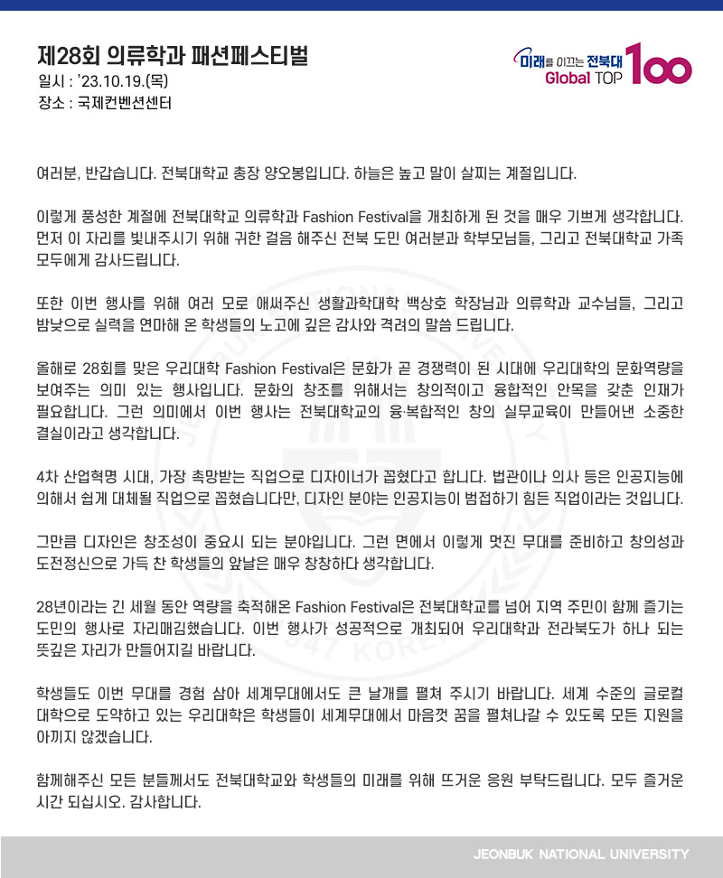 28년이라는 긴 세월 동안 역량을 축적해온 Fashion Festival은 전북대학교를 넘어 지역 주민이 함께 즐기는 도민의 행사로 자리매김했습니다. 이번 행사가 성공적으로 개최되어 우리대학과 전라북도가 하나 되는 뜻깊은 자리가 만들어지길 바랍니다.