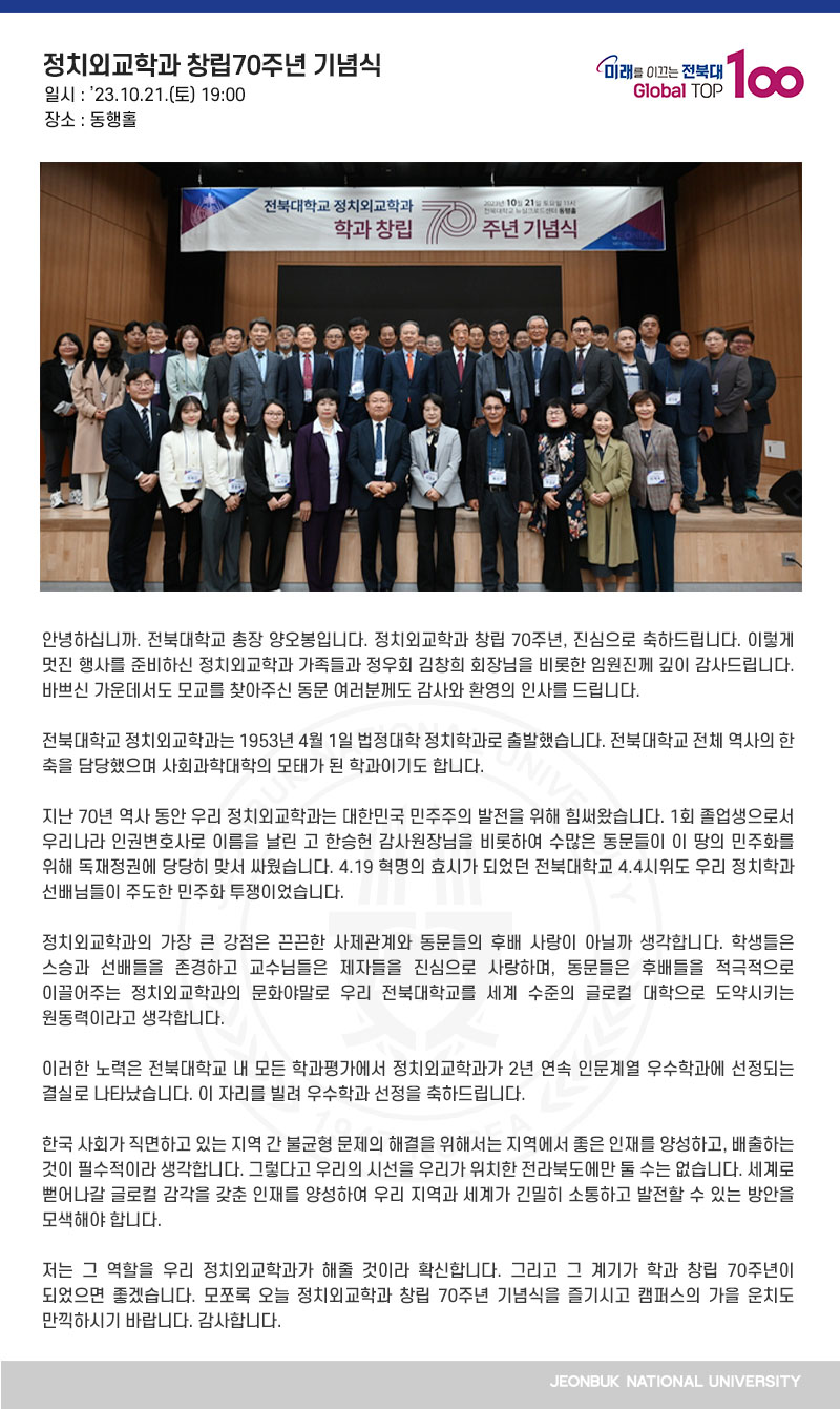 안녕하십니까. 전북대학교 총장 양오봉입니다. 정치외교학과 창립 70주년, 진심으로 축하드립니다. 이렇게 멋진 행사를 준비하신 정치외교학과 가족들과 정우회 김창희 회장님을 비롯한 임원진께 깊이 감사드립니다. 바쁘신 가운데서도 모교를 찾아주신 동문 여러분께도 감사와 환영의 인사를 드립니다. 전북대학교 정치외교학과는 1953년 4월 1일 법정대학 정치학과로 출발했습니다. 전북대학교 전체 역사의 한 축을 담당했으며 사회과학대학의 모태가 된 학과이기도 합니다. 지난 70년 역사 동안 우리 정치외교학과는 대한민국 민주주의 발전을 위해 힘써왔습니다. 1회 졸업생으로서 우리나라 인권변호사로 이름을 날린 고 한승헌 감사원장님을 비롯하여 수많은 동문들이 이 땅의 민주화를 위해 독재정권에 당당히 맞서 싸웠습니다. 4.19 혁명의 효시가 되었던 전북대학교 4.4시위도 우리 정치학과 선배님들이 주도한 민주화 투쟁이었습니다. 정치외교학과의 가장 큰 강점은 끈끈한 사제관계와 동문들의 후배 사랑이 아닐까 생각합니다. 학생들은 스승과 선배들을 존경하고 교수님들은 제자들을 진심으로 사랑하며, 동문들은 후배들을 적극적으로 이끌어주는 정치외교학과의 문화야말로 우리 전북대학교를 세계 수준의 글로컬 대학으로 도약시키는 원동력이라고 생각합니다. 이러한 노력은 전북대학교 내 모든 학과평가에서 정치외교학과가 2년 연속 인문계열 우수학과에 선정되는 결실로 나타났습니다. 이 자리를 빌려 우수학과 선정을 축하드립니다. 한국 사회가 직면하고 있는 지역 간 불균형 문제의 해결을 위해서는 지역에서 좋은 인재를 양성하고, 배출하는 것이 필수적이라 생각합니다. 그렇다고 우리의 시선을 우리가 위치한 전라북도에만 둘 수는 없습니다. 세계로 뻗어나갈 글로컬 감각을 갖춘 인재를 양성하여 우리 지역과 세계가 긴밀히 소통하고 발전할 수 있는 방안을 모색해야 합니다. 저는 그 역할을 우리 정치외교학과가 해줄 것이라 확신합니다. 그리고 그 계기가 학과 창립 70주년이 되었으면 좋겠습니다. 모쪼록 오늘 정치외교학과 창립 70주년 기념식을 즐기시고 캠퍼스의 가을 운치도 만끽하시기 바랍니다. 감사합니다.