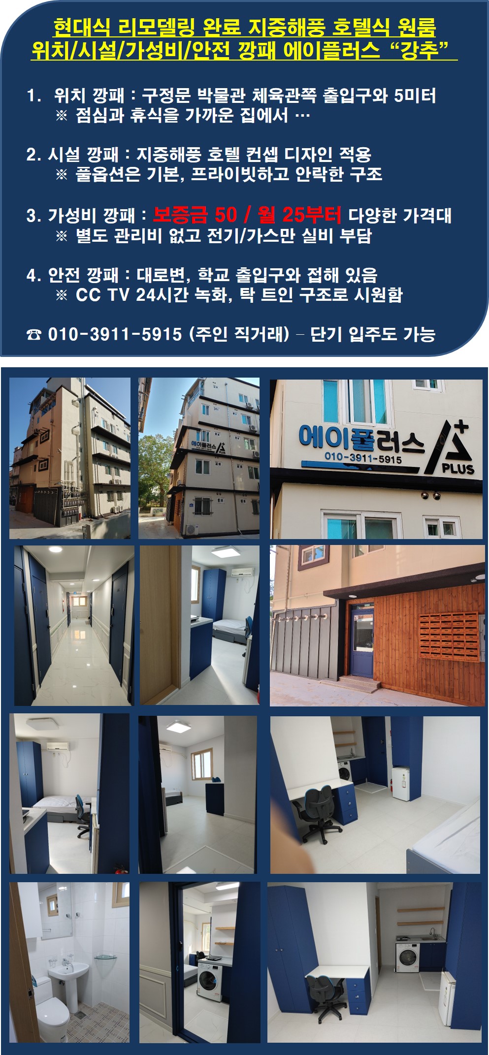 [단기 가능한 호텔식 신축 원룸 / 저렴한 입주 및 거주 비용] 최고의 위치에 세련된 지중해풍 호텔식 신축 원룸 - 가장 저렴한 새집