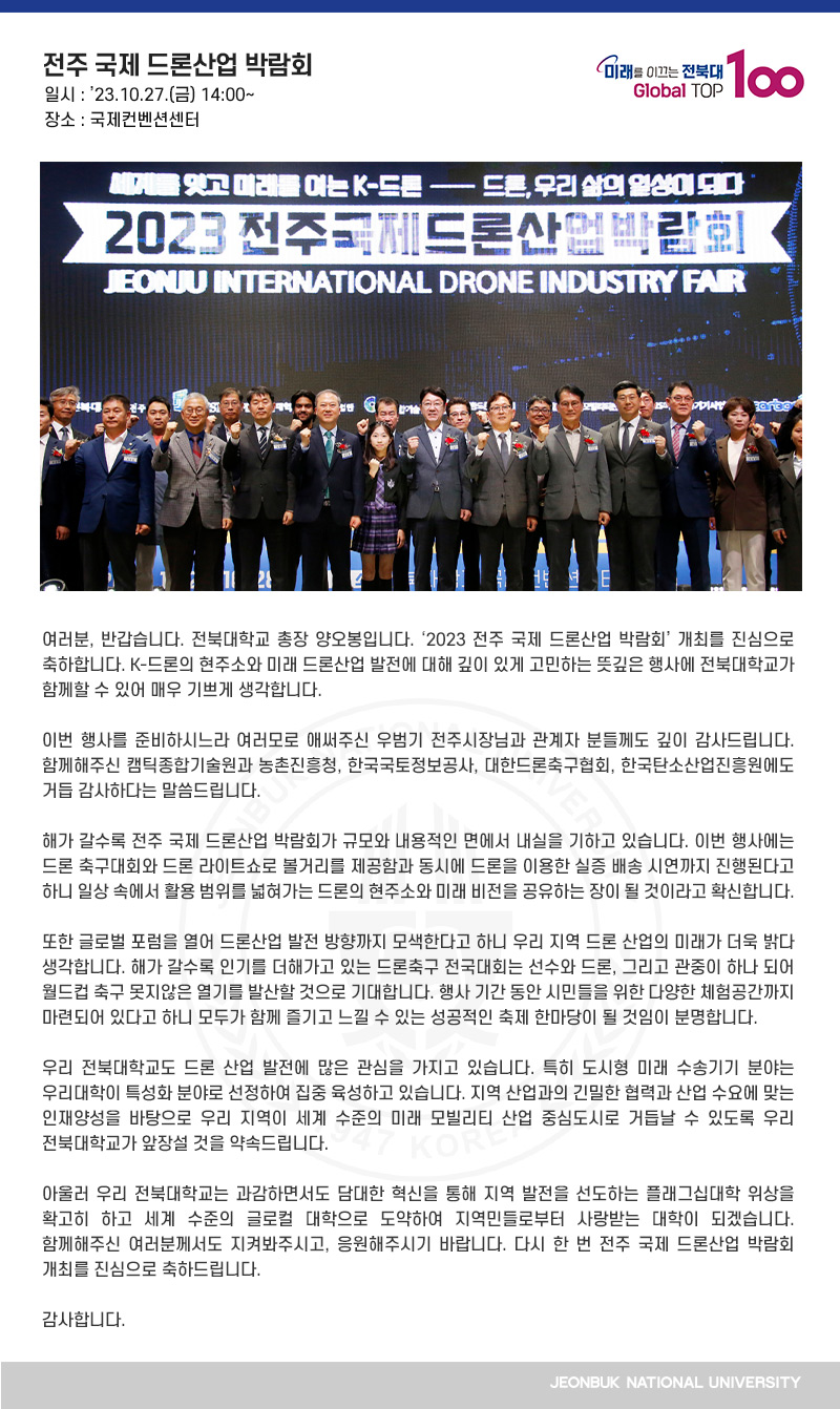 여러분, 반갑습니다. 전북대학교 총장 양오봉입니다. ‘2023 전주 국제 드론산업 박람회’ 개최를 진심으로 축하합니다. K-드론의 현주소와 미래 드론산업 발전에 대해 깊이 있게 고민하는 뜻깊은 행사에 전북대학교가 함께할 수 있어 매우 기쁘게 생각합니다. 이번 행사를 준비하시느라 여러모로 애써주신 우범기 전주시장님과 관계자 분들께도 깊이 감사드립니다. 함께해주신 캠틱종합기술원과 농촌진흥청, 한국국토정보공사, 대한드론축구협회, 한국탄소산업진흥원에도 거듭 감사하다는 말씀드립니다. 해가 갈수록 전주 국제 드론산업 박람회가 규모와 내용적인 면에서 내실을 기하고 있습니다. 이번 행사에는 드론 축구대회와 드론 라이트쇼로 볼거리를 제공함과 동시에 드론을 이용한 실증 배송 시연까지 진행된다고 하니 일상 속에서 활용 범위를 넓혀가는 드론의 현주소와 미래 비전을 공유하는 장이 될 것이라고 확신합니다. 또한 글로벌 포럼을 열어 드론산업 발전 방향까지 모색한다고 하니 우리 지역 드론 산업의 미래가 더욱 밝다 생각합니다. 해가 갈수록 인기를 더해가고 있는 드론축구 전국대회는 선수와 드론, 그리고 관중이 하나 되어 월드컵 축구 못지않은 열기를 발산할 것으로 기대합니다. 행사 기간 동안 시민들을 위한 다양한 체험공간까지 마련되어 있다고 하니 모두가 함께 즐기고 느낄 수 있는 성공적인 축제 한마당이 될 것임이 분명합니다. 우리 전북대학교도 드론 산업 발전에 많은 관심을 가지고 있습니다. 특히 도시형 미래 수송기기 분야는 우리대학이 특성화 분야로 선정하여 집중 육성하고 있습니다. 지역 산업과의 긴밀한 협력과 산업 수요에 맞는 인재양성을 바탕으로 우리 지역이 세계 수준의 미래 모빌리티 산업 중심도시로 거듭날 수 있도록 우리 전북대학교가 앞장설 것을 약속드립니다. 아울러 우리 전북대학교는 과감하면서도 담대한 혁신을 통해 지역 발전을 선도하는 플래그십대학 위상을 확고히 하고 세계 수준의 글로컬 대학으로 도약하여 지역민들로부터 사랑받는 대학이 되겠습니다. 함께해주신 여러분께서도 지켜봐주시고, 응원해주시기 바랍니다. 다시 한 번 전주 국제 드론산업 박람회 개최를 진심으로 축하드립니다. 감사합니다.