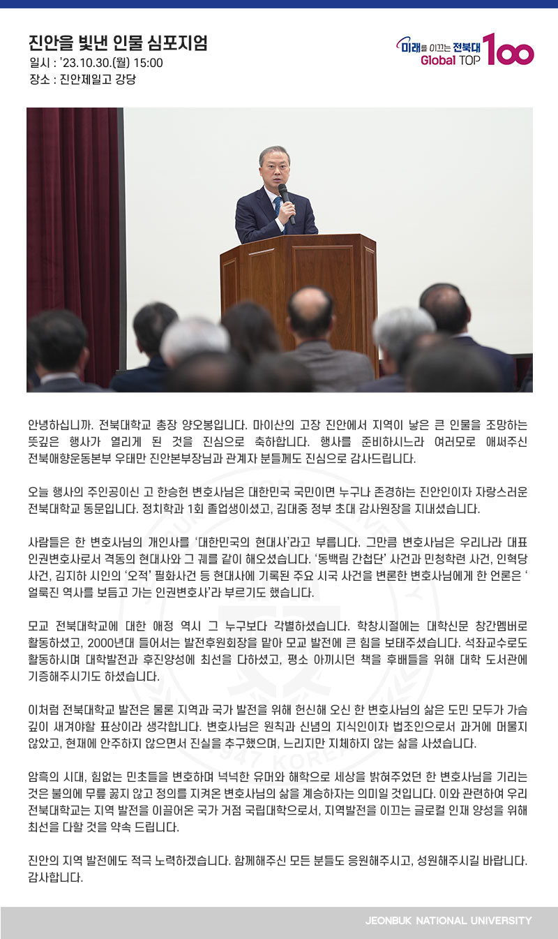 안녕하십니까. 전북대학교 총장 양오봉입니다. 마이산의 고장 진안에서 지역이 낳은 큰 인물을 조망하는 뜻깊은 행사가 열리게 된 것을 진심으로 축하합니다. 행사를 준비하시느라 여러모로 애써주신 전북애향운동본부 우태만 진안본부장님과 관계자 분들께도 진심으로 감사드립니다. 오늘 행사의 주인공이신 고 한승헌 변호사님은 대한민국 국민이면 누구나 존경하는 진안인이자 자랑스러운 전북대학교 동문입니다. 정치학과 1회 졸업생이셨고, 김대중 정부 초대 감사원장을 지내셨습니다. 사람들은 한 변호사님의 개인사를 ‘대한민국의 현대사’라고 부릅니다. 그만큼 변호사님은 우리나라 대표 인권변호사로서 격동의 현대사와 그 궤를 같이 해오셨습니다. ‘동백림 간첩단’ 사건과 민청학련 사건, 인혁당 사건, 김지하 시인의 ‘오적’ 필화사건 등 현대사에 기록된 주요 시국 사건을 변론한 변호사님에게 한 언론은 ‘얼룩진 역사를 보듬고 가는 인권변호사’라 부르기도 했습니다. 모교 전북대학교에 대한 애정 역시 그 누구보다 각별하셨습니다. 학창시절에는 대학신문 창간멤버로 활동하셨고, 2000년대 들어서는 발전후원회장을 맡아 모교 발전에 큰 힘을 보태주셨습니다. 석좌교수로도 활동하시며 대학발전과 후진양성에 최선을 다하셨고, 평소 아끼시던 책을 후배들을 위해 대학 도서관에 기증해주시기도 하셨습니다. 이처럼 전북대학교 발전은 물론 지역과 국가 발전을 위해 헌신해 오신 한 변호사님의 삶은 도민 모두가 가슴 깊이 새겨야할 표상이라 생각합니다. 변호사님은 원칙과 신념의 지식인이자 법조인으로서 과거에 머물지 않았고, 현재에 안주하지 않으면서 진실을 추구했으며, 느리지만 지체하지 않는 삶을 사셨습니다. 암흑의 시대, 힘없는 민초들을 변호하며 넉넉한 유머와 해학으로 세상을 밝혀주었던 한 변호사님을 기리는 것은 불의에 무릎 꿇지 않고 정의를 지켜온 변호사님의 삶을 계승하자는 의미일 것입니다. 이와 관련하여 우리 전북대학교는 지역 발전을 이끌어온 국가 거점 국립대학으로서, 지역발전을 이끄는 글로컬 인재 양성을 위해 최선을 다할 것을 약속 드립니다. 진안의 지역 발전에도 적극 노력하겠습니다. 함께해주신 모든 분들도 응원해주시고, 성원해주시길 바랍니다. 감사합니다.
