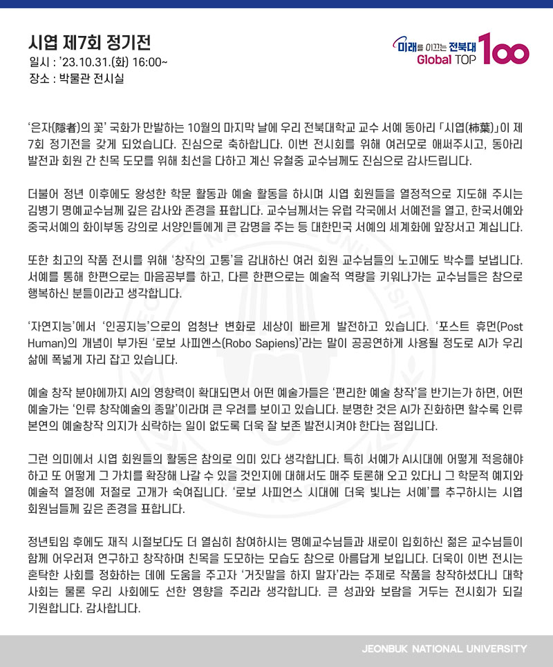 ‘은자(隱者)의 꽃’ 국화가 만발하는 10월의 마지막 날에 우리 전북대학교 교수 서예 동아리 「시엽(柿葉)」이 제7회 정기전을 갖게 되었습니다. 진심으로 축하합니다. 이번 전시회를 위해 여러모로 애써주시고, 동아리 발전과 회원 간 친목 도모를 위해 최선을 다하고 계신 유철중 교수님께도 진심으로 감사드립니다. 더불어 정년 이후에도 왕성한 학문 활동과 예술 활동을 하시며 시엽 회원들을 열정적으로 지도해 주시는 김병기 명예교수님께 깊은 감사와 존경을 표합니다. 교수님께서는 유럽 각국에서 서예전을 열고, 한국서예와 중국서예의 화이부동 강의로 서양인들에게 큰 감명을 주는 등 대한민국 서예의 세계화에 앞장서고 계십니다. 또한 최고의 작품 전시를 위해 ‘창작의 고통’을 감내하신 여러 회원 교수님들의 노고에도 박수를 보냅니다. 서예를 통해 한편으로는 마음공부를 하고, 다른 한편으로는 예술적 역량을 키워나가는 교수님들은 참으로 행복하신 분들이라고 생각합니다. ‘자연지능’에서 ‘인공지능’으로의 엄청난 변화로 세상이 빠르게 발전하고 있습니다. ‘포스트 휴먼(Post Human)의 개념이 부가된 ‘로보 사피엔스(Robo Sapiens)’라는 말이 공공연하게 사용될 정도로 AI가 우리 삶에 폭넓게 자리 잡고 있습니다. 예술 창작 분야에까지 AI의 영향력이 확대되면서 어떤 예술가들은 ‘편리한 예술 창작’을 반기는가 하면, 어떤 예술가는 ‘인류 창작예술의 종말’이라며 큰 우려를 보이고 있습니다. 분명한 것은 AI가 진화하면 할수록 인류 본연의 예술창작 의지가 쇠락하는 일이 없도록 더욱 잘 보존 발전시켜야 한다는 점입니다. 그런 의미에서 시엽 회원들의 활동은 참의로 의미 있다 생각합니다. 특히 서예가 AI시대에 어떻게 적응해야 하고 또 어떻게 그 가치를 확장해 나갈 수 있을 것인지에 대해서도 매주 토론해 오고 있다니 그 학문적 예지와 예술적 열정에 저절로 고개가 숙여집니다. ‘로보 사피언스 시대에 더욱 빛나는 서예’를 추구하시는 시엽 회원님들께 깊은 존경을 표합니다. 정년퇴임 후에도 재직 시절보다도 더 열심히 참여하시는 명예교수님들과 새로이 입회하신 젊은 교수님들이 함께 어우러져 연구하고 창작하며 친목을 도모하는 모습도 참으로 아름답게 보입니다. 더욱이 이번 전시는 혼탁한 사회를 정화하는 데에 도움을 주고자 ‘거짓말을 하지 말자’라는 주제로 작품을 창작하셨다니 대학 사회는 물론 우리 사회에도 선한 영향을 주리라 생각합니다. 큰 성과와 보람을 거두는 전시회가 되길 기원합니다. 감사합니다.