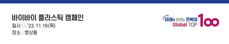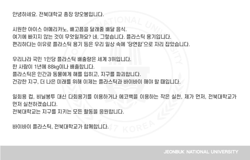 안녕하세요. 전북대학교 총장 양오봉입니다. 시원한 아이스 아메리카노, 배고픔을 달래줄 배달 음식. 여기에 빠지지 않는 것이 무엇일까요? 네, 그렇습니다. 플라스틱 용기입니다. 편리하다는 이유로 플라스틱 용기 등은 우리 일상 속에 ‘당연함’으로 자리 잡았습니다. 우리나라 국민 1인당 플라스틱 배출량은 세계 3위입니다. 한 사람이 1년에 88kg이나 배출합니다. 플라스틱은 인간과 동물에게 해를 입히고, 지구를 파괴합니다. 건강한 지구, 더 나은 미래를 위해 이제는 플라스틱과 바이바이 해야 할 때입니다. 일회용 컵, 비닐봉투 대신 다회용기를 이용하거나 에코백을 이용하는 작은 실천, 제가 먼저, 전북대학교가 먼저 실천하겠습니다. 전북대학교는 지구를 지키는 모든 활동을 응원합니다. 바이바이 플라스틱, 전북대학교가 함께합니다.