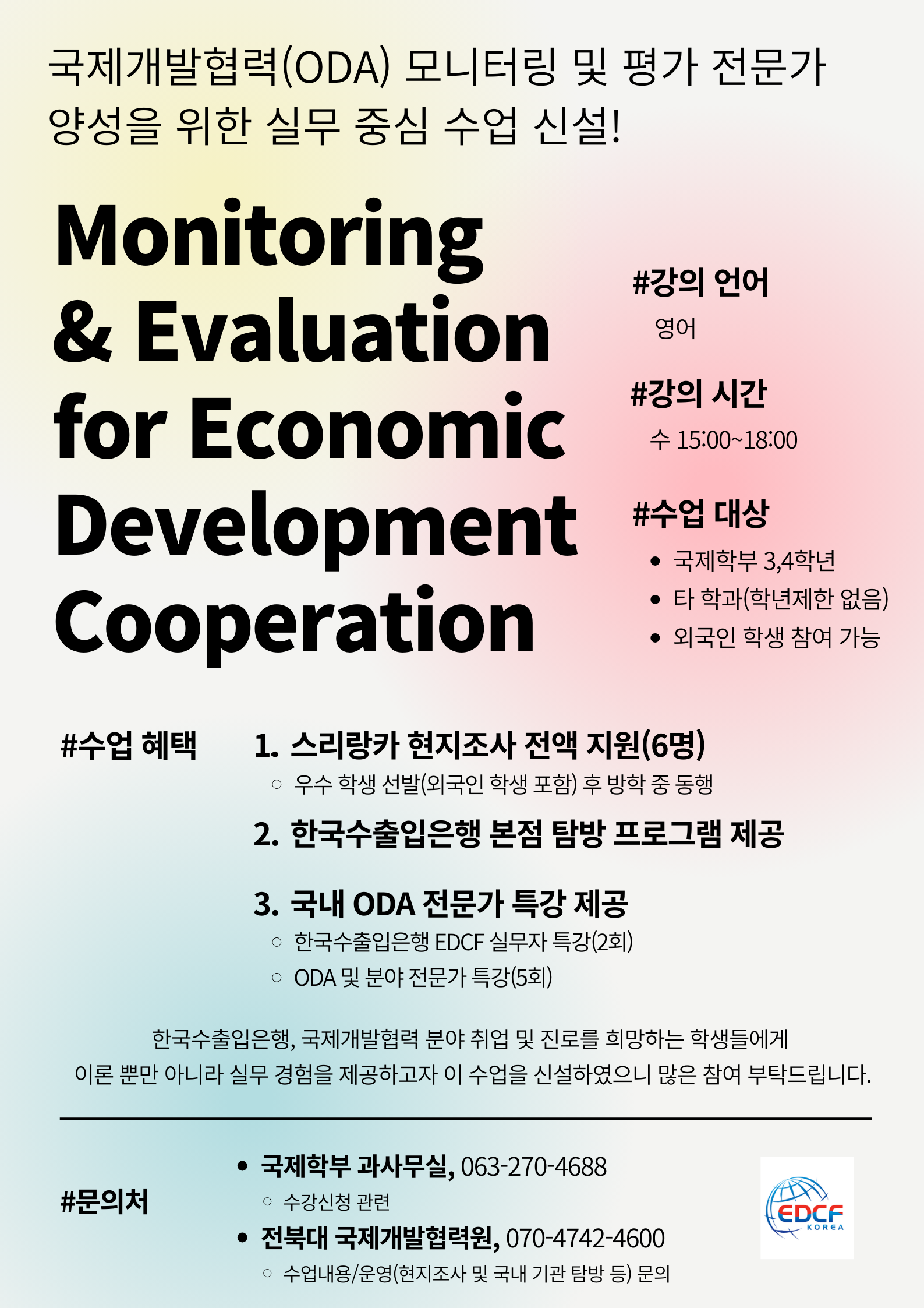 2025년 1학기에 개설되는 국제개발협력(ODA) 모니터링 및 평가전문가 양성을 위한 실무중심의 수업이 신설되어 안내드립니다.
