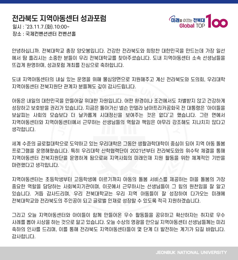 안녕하십니까. 전북대학교 총장 양오봉입니다. 건강한 전라북도와 희망찬 대한민국을 만드는데 가장 일선에서 땀 흘리시는 소중한 분들이 우리 전북대학교를 찾아주셨습니다. 도내 지역아동센터 소속 선생님들을 뜨겁게 환영하며, 성과포럼 개최를 진심으로 축하합니다. 도내 지역아동센터의 내실 있는 운영을 위해 물심양면으로 지원해주고 계신 전라북도와 도의회, 우리대학 지역아동센터 전북지원단 관계자 분들께도 깊이 감사드립니다. 아동은 내일의 대한민국을 만들어갈 위대한 자원입니다. 어떤 환경이나 조건에서도 차별받지 않고 건강하게 성장하고 보호받을 권리가 있습니다. 지금은 돌아가신 넬슨 만델라 남아프리카공화국 전 대통령은 ‘아이들을 보살피는 사회의 모습보다 더 날카롭게 시대정신을 보여주는 것은 없다’고 했습니다. 그런 면에서 지역아동센터와 지역아동센터에서 근무하는 선생님들의 역할과 책임은 아무리 강조해도 지나치지 않다고 생각합니다. 세계 수준의 글로컬대학으로 도약하고 있는 우리대학은 그동안 생활과학대학이 중심이 되어 지역 아동 돌봄 프로그램을 운영해왔습니다. 특히 우리대학 산학협력단이 2021년부터 전라북도와의 위수탁 체결을 통해 지역아동센터 전북지원단을 운영하게 됨으로써 지역사회의 미래인재 지원 활동을 위한 체계적인 기반을 마련했다고 생각합니다. 지역아동센터는 초등학생부터 고등학생에 이르기까지 아동의 돌봄 서비스를 제공하는 마을 돌봄의 가장 중요한 역할을 담당하는 사회복지기관이며, 이곳에서 근무하시는 선생님들이 그 힘의 원천임을 잘 알고 있습니다. 거듭 감사드리며, 우리 전북대학교는 우리 지역 아동들이 잘 성장하여 다가오는 미래에 전북대학교와 전라북도의 주인공이 되고 글로벌 인재로 성장할 수 있도록 적극 지원하겠습니다. 그리고 오늘 지역아동센터와 아이들이 함께 만들어온 우수 활동들을 공유하고 확산하자는 취지로 우수 사례를 뽑아 시상을 하는 것으로 알고 있습니다. 오늘 수상의 영광을 안으실 지역아동센터 선생님들께는 미리 축하의 인사를 드리며, 이를 통해 전라북도 지역아동센터들이 몇 단계 더 발전하는 계기가 되길 바랍니다. 감사합니다.