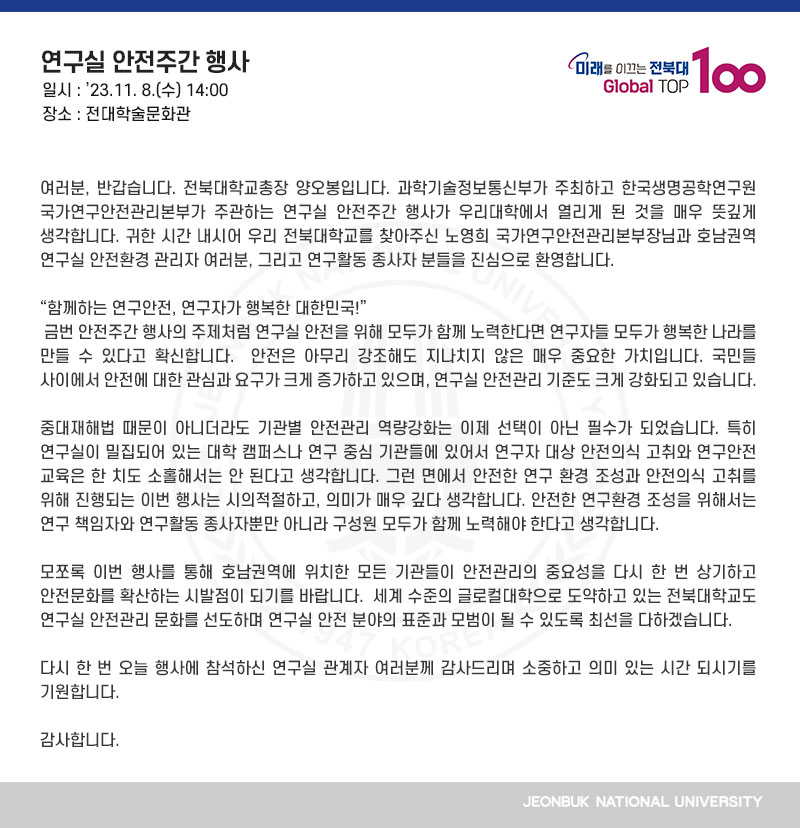 여러분, 반갑습니다. 전북대학교총장 양오봉입니다. 과학기술정보통신부가 주최하고 한국생명공학연구원 국가연구안전관리본부가 주관하는 연구실 안전주간 행사가 우리대학에서 열리게 된 것을 매우 뜻깊게 생각합니다. 귀한 시간 내시어 우리 전북대학교를 찾아주신 노영희 국가연구안전관리본부장님과 호남권역 연구실 안전환경 관리자 여러분, 그리고 연구자 분들을 진심으로 환영합니다. “함께하는 연구안전, 연구자가 행복한 대한민국!” 금번 안전주간 행사의 주제처럼 연구실 안전을 위해 모두가 함께 노력한다면 연구자들 모두가 행복한 나라를 만들 수 있다고 확신합니다. 안전은 아무리 강조해도 지나치지 않은 매우 중요한 가치입니다. 연구실 안전관리가 부실한 경우 금전적 피해는 물론 인명사고까지 발생할 수 있습니다. 이와 같은 피해는 양질의 연구성과 창출에 있어서 치명적인 영향을 미치고, 더 나아가 우리나라의 연구 경쟁력까지 위험할 수 있습니다. 최근 국민들 사이에서 안전에 대한 관심과 요구가 크게 증가하고 있으며, 연구실 안전관리 기준도 크게 강화되고 있습니다. 중대재해법 때문이 아니더라도 기관별 안전관리 역량강화는 이제 선택이 아닌 필수가 되었습니다. 특히 연구실이 밀집되어 있는 대학 캠퍼스나 연구 중심 기관들에 있어서 연구자 대상 안전의식 고취와 연구안전 교육은 한 치도 소홀해서는 안 된다고 생각합니다. 그런 면에서 안전한 연구 환경 조성과 안전의식 고취를 위해 진행되는 이번 행사는 시의적절하고, 의미가 매우 깊다 생각합니다. 안전한 연구환경 조성을 위해서는 연구 책임자와 연구자뿐만 아니라 대학이나 기관의 구성원 모두가 함께 노력해야 한다고 생각합니다. 모쪼록 이번 행사를 통해 호남권역에 위치한 모든 대학과 기관들이 안전관리의 중요성을 다시 한 번 상기하고 안전문화를 확산하는 시발점이 되기를 바랍니다. 세계 수준의 글로컬대학으로 도약하고 있는 전북대학교도 연구실 안전관리 문화를 선도하며 연구실 안전 분야의 표준과 모범이 될 수 있도록 최선을 다하겠습니다. 다시 한 번 오늘 행사에 참석하신 연구실 관계자 여러분께 감사드리며 소중하고 의미 있는 시간 되시기를 기원합니다. 감사합니다.
