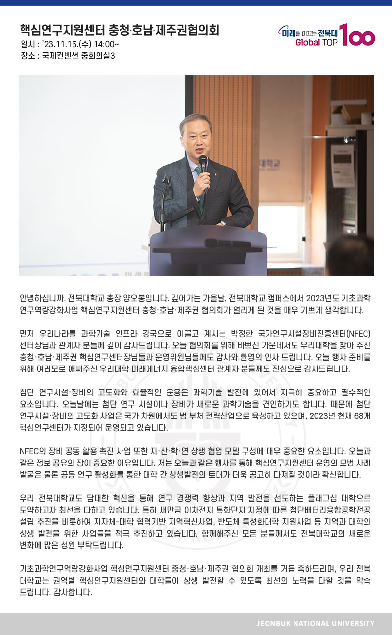 안녕하십니까. 전북대학교 총장 양오봉입니다. 깊어가는 가을날, 전북대학교 캠퍼스에서 2023년도 기초과학연구역량강화사업 핵심연구지원센터 충청·호남·제주권 협의회가 열리게 된 것을 매우 기쁘게 생각합니다.