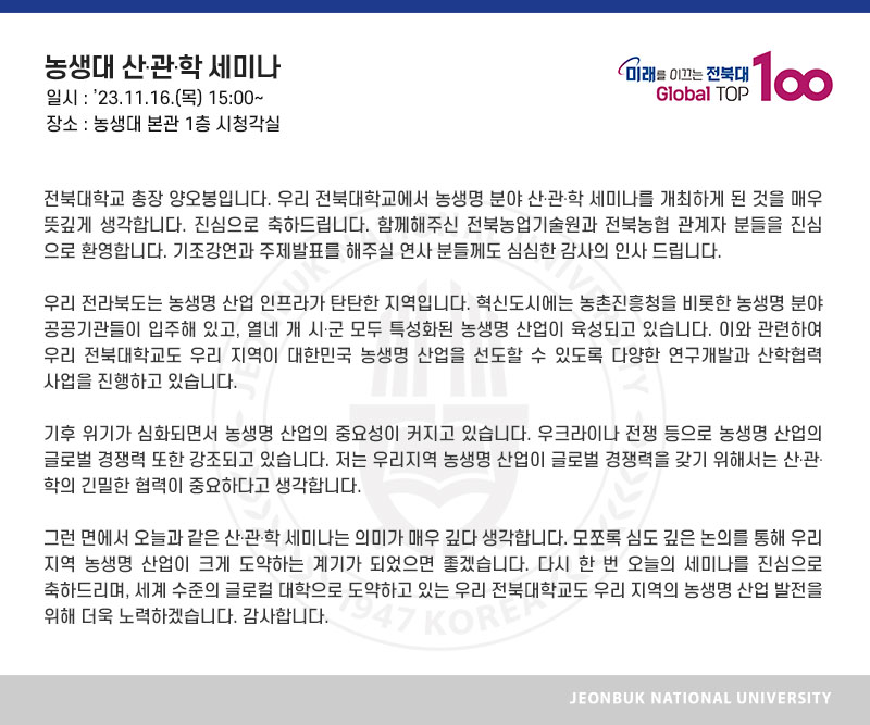 그런 면에서 오늘과 같은 산․관․학 세미나는 의미가 매우 깊다 생각합니다. 모쪼록 심도 깊은 논의를 통해 우리 지역 농생명 산업이 크게 도약하는 계기가 되었으면 좋겠습니다. 다시 한 번 오늘의 세미나를 진심으로 축하드리며, 세계 수준의 글로컬 대학으로 도약하고 있는 우리 전북대학교도 우리 지역의 농생명 산업 발전을 위해 더욱 노력하겠습니다. 감사합니다.