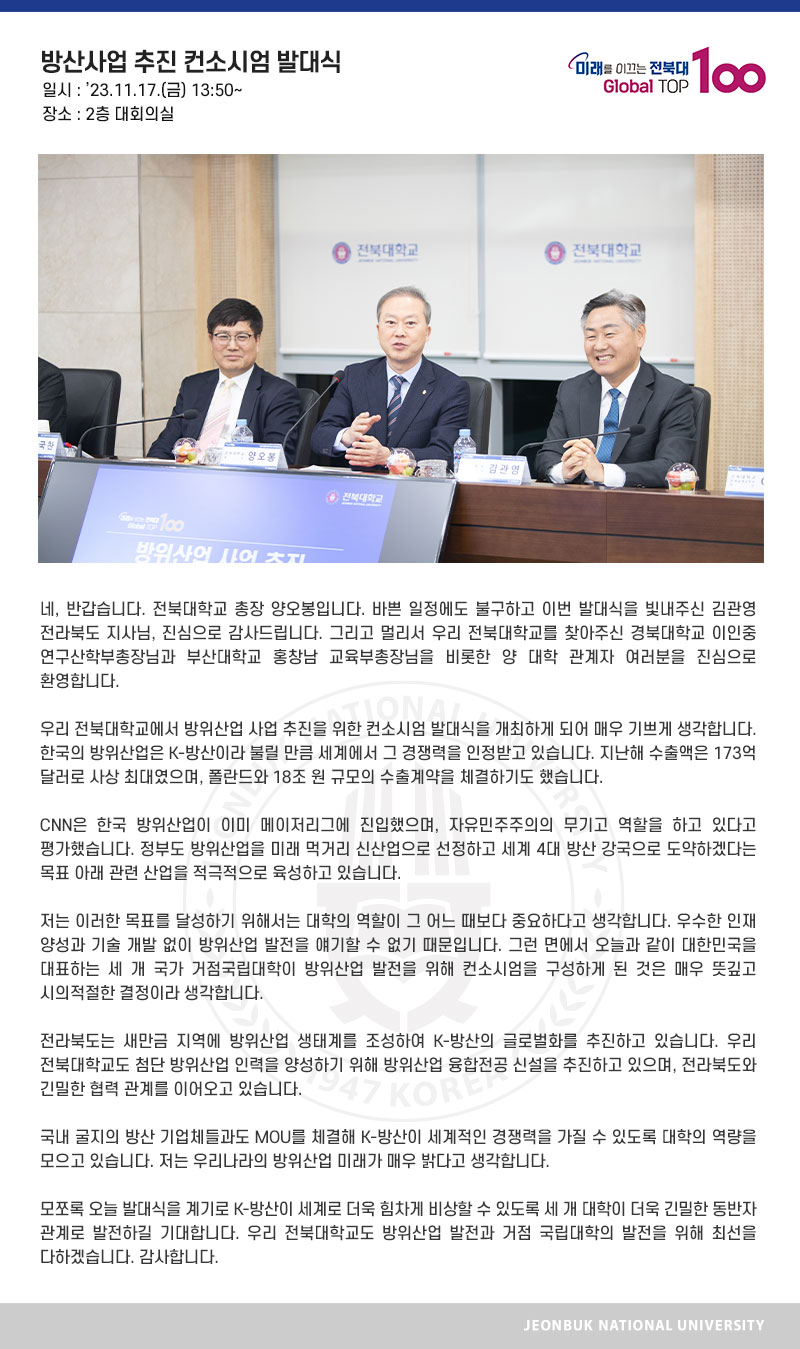 네, 반갑습니다. 전북대학교 총장 양오봉입니다. 바쁜 일정에도 불구하고 이번 발대식을 빛내주신 김관영 전라북도 지사님, 진심으로 감사드립니다. 그리고 멀리서 우리 전북대학교를 찾아주신 경북대학교 이인중 연구산학부총장님과 부산대학교 홍창남 교육부총장님을 비롯한 양 대학 관계자 여러분을 진심으로 환영합니다. 우리 전북대학교에서 방위산업 사업 추진을 위한 컨소시엄 발대식을 개최하게 되어 매우 기쁘게 생각합니다. 한국의 방위산업은 K-방산이라 불릴 만큼 세계에서 그 경쟁력을 인정받고 있습니다. 지난해 수출액은 173억 달러로 사상 최대였으며, 폴란드와 18조 원 규모의 수출계약을 체결하기도 했습니다. CNN은 한국 방위산업이 이미 메이저리그에 진입했으며, 자유민주주의의 무기고 역할을 하고 있다고 평가했습니다. 정부도 방위산업을 미래 먹거리 신산업으로 선정하고 세계 4대 방산 강국으로 도약하겠다는 목표 아래 관련 산업을 적극적으로 육성하고 있습니다. 저는 이러한 목표를 달성하기 위해서는 대학의 역할이 그 어느 때보다 중요하다고 생각합니다. 우수한 인재 양성과 기술 개발 없이 방위산업 발전을 얘기할 수 없기 때문입니다. 그런 면에서 오늘과 같이 대한민국을 대표하는 세 개 국가 거점국립대학이 방위산업 발전을 위해 컨소시엄을 구성하게 된 것은 매우 뜻깊고 시의적절한 결정이라 생각합니다. 전라북도는 새만금 지역에 방위산업 생태계를 조성하여 K-방산의 글로벌화를 추진하고 있습니다. 우리 전북대학교도 첨단 방위산업 인력을 양성하기 위해 방위산업 융합전공 신설을 추진하고 있으며, 전라북도와 긴밀한 협력 관계를 이어오고 있습니다. 국내 굴지의 방산 기업체들과도 MOU를 체결해 K-방산이 세계적인 경쟁력을 가질 수 있도록 대학의 역량을 모으고 있습니다. 저는 우리나라의 방위산업 미래가 매우 밝다고 생각합니다. 모쪼록 오늘 발대식을 계기로 K-방산이 세계로 더욱 힘차게 비상할 수 있도록 세 개 대학이 더욱 긴밀한 동반자 관계로 발전하길 기대합니다. 우리 전북대학교도 방위산업 발전과 거점 국립대학의 발전을 위해 최선을 다하겠습니다. 감사합니다.