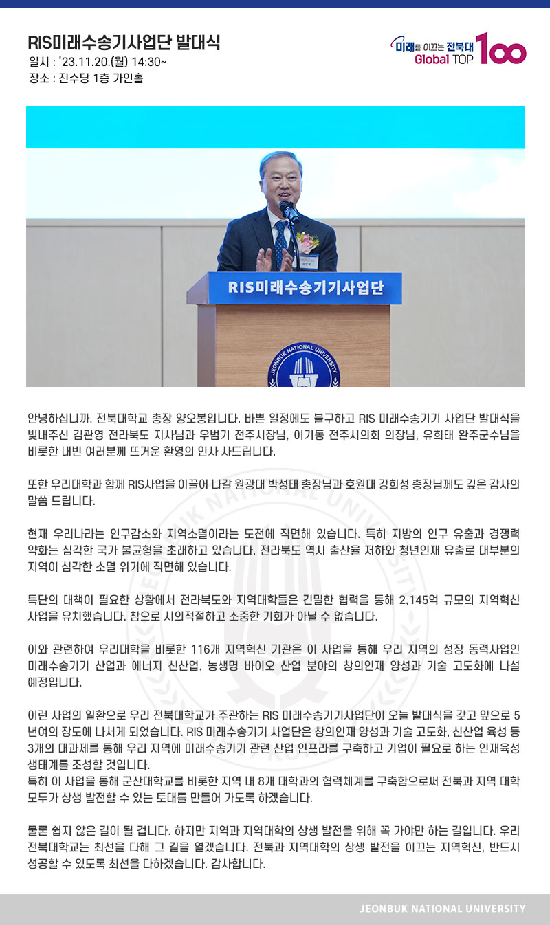 안녕하십니까. 전북대학교 총장 양오봉입니다. 바쁜 일정에도 불구하고 RIS 미래수송기기 사업단 발대식을 빛내주신 김관영 전라북도 지사님과 우범기 전주시장님, 이기동 전주시의회 의장님, 유희태 완주군수님을 비롯한 내빈 여러분께 뜨거운 환영의 인사 사드립니다. 또한 우리대학과 함께 RIS사업을 이끌어 나갈 원광대 박성태 총장님과 호원대 강희성 총장님께도 깊은 감사의 말씀 드립니다. 현재 우리나라는 인구감소와 지역소멸이라는 도전에 직면해 있습니다. 특히 지방의 인구 유출과 경쟁력 약화는 심각한 국가 불균형을 초래하고 있습니다. 전라북도 역시 출산율 저하와 청년인재 유출로 대부분의 지역이 심각한 소멸 위기에 직면해 있습니다. 특단의 대책이 필요한 상황에서 전라북도와 지역대학들은 긴밀한 협력을 통해 2,145억 규모의 지역혁신 사업을 유치했습니다. 참으로 시의적절하고 소중한 기회가 아닐 수 없습니다. 이와 관련하여 우리대학을 비롯한 116개 지역혁신 기관은 이 사업을 통해 우리 지역의 성장 동력사업인 미래수송기기 산업과 에너지 신산업, 농생명 바이오 산업 분야의 창의인재 양성과 기술 고도화에 나설 예정입니다. 이런 사업의 일환으로 우리 전북대학교가 주관하는 RIS 미래수송기기사업단이 오늘 발대식을 갖고 앞으로 5년여의 장도에 나서게 되었습니다. RIS 미래수송기기 사업단은 창의인재 양성과 기술 고도화, 신산업 육성 등 3개의 대과제를 통해 우리 지역에 미래수송기기 관련 산업 인프라를 구축하고 기업이 필요로 하는 인재육성 생태계를 조성할 것입니다. 특히 이 사업을 통해 군산대학교를 비롯한 지역 내 8개 대학과의 협력체계를 구축함으로써 전북과 지역 대학 모두가 상생 발전할 수 있는 토대를 만들어 가도록 하겠습니다. 물론 쉽지 않은 길이 될 겁니다. 하지만 지역과 지역대학의 상생 발전을 위해 꼭 가야만 하는 길입니다. 우리 전북대학교는 최선을 다해 그 길을 열겠습니다. 전북과 지역대학의 상생 발전을 이끄는 지역혁신, 반드시 성공할 수 있도록 최선을 다하겠습니다. 감사합니다.