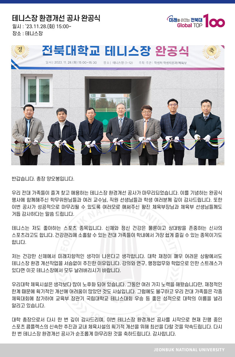 대학 총장으로서 다시 한 번 깊이 감사드리며, 이번 테니스장 환경개선 공사를 시작으로 현재 진행 중인 스포츠 콤플렉스의 신속한 추진과 교내 체육시설의 획기적 개선을 위해 최선을 다할 것을 약속드립니다. 다시 한 번 테니스장 환경개선 공사가 순조롭게 마무리된 것을 축하드립니다. 감사합니다.