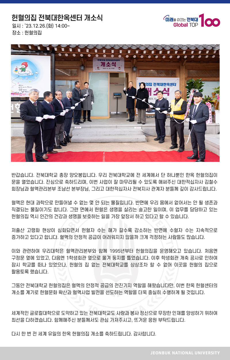 반갑습니다. 전북대학교 총장 양오봉입니다. 우리 전북대학교에 전 세계에서 단 하나뿐인 한옥 헌혈의집이 문을 열었습니다. 진심으로 축하드리며, 이번 사업이 잘 마무리될 수 있도록 애써주신 대한적십자사 김철수 회장님과 혈액관리본부 조남선 본부장님, 그리고 대한적십자사 전북지사 관계자 분들께 깊이 감사드립니다. 혈액은 현대 과학으로 만들어낼 수 없는 몇 안 되는 물질입니다. 반면에 우리 몸에서 없어서는 안 될 생존과 직결되는 물질이기도 합니다. 그런 면에서 헌혈은 생명을 살리는 숭고한 일이며, 이 업무를 담당하고 있는 헌혈의집 역시 인간의 건강과 생명을 보호하는 일을 가장 앞장서 하고 있다고 할 수 있습니다. 저출산 고령화 현상이 심화되면서 헌혈자 수는 해가 갈수록 감소하는 반면에 수혈자 수는 지속적으로 증가하고 있다고 합니다. 혈액의 안정적 공급이 어려워지지 않을까 크게 걱정하는 사람들도 많습니다. 이와 관련하여 우리대학은 혈액관리본부와 함께 1995년부터 헌혈의집을 운영해오고 있습니다. 처음엔 구정문 옆에 있었고, 다음엔 1학생회관 옆으로 옮겨 둥지를 틀었습니다. 이후 학생회관 개축 공사로 인하여 잠시 학교를 떠나 있었으나, 헌혈의 집 없는 전북대학교를 상상조차 할 수 없어 이곳을 헌혈의 집으로 활용토록 했습니다. 그동안 전북대학교 헌혈의집은 혈액의 안정적 공급의 전진기지 역할을 해왔습니다만, 이번 한옥 헌혈센터의 개소를 계기로 헌혈문화 확산과 혈액사업 발전을 선도하는 역할을 더욱 충실히 수행하게 될 것입니다. 세계적인 글로컬대학으로 도약하고 있는 전북대학교도 사랑과 봉사 정신으로 무장한 인재를 양성하기 위하여 최선을 다하겠습니다. 함께해주신 분들께서도 관심 가져주시고, 뜨거운 응원 부탁드립니다. 다시 한 번 전 세계 유일의 한옥 헌혈의집 개소를 축하드립니다. 감사합니다.
