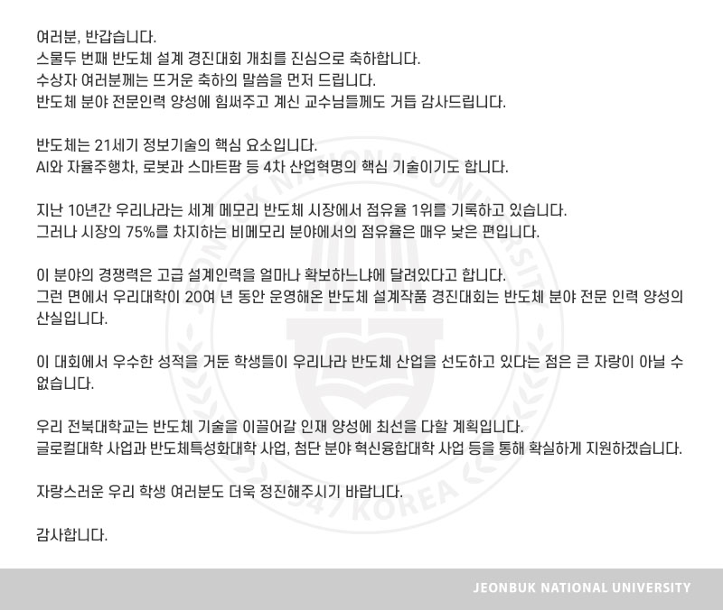 여러분, 반갑습니다. 스물두 번째 반도체 설계 경진대회 개최를 진심으로 축하합니다. 수상자 여러분께는 뜨거운 축하의 말씀을 먼저 드립니다. 반도체 분야 전문인력 양성에 힘써주고 계신 교수님들께도 거듭 감사드립니다. 반도체는 21세기 정보기술의 핵심 요소입니다. AI와 자율주행차, 로봇과 스마트팜 등 4차 산업혁명의 핵심 기술이기도 합니다. 지난 10년간 우리나라는 세계 메모리 반도체 시장에서 점유율 1위를 기록하고 있습니다. 그러나 시장의 75%를 차지하는 비메모리 분야에서의 점유율은 매우 낮은 편입니다. 이 분야의 경쟁력은 고급 설계인력을 얼마나 확보하느냐에 달려있다고 합니다. 그런 면에서 우리대학이 20여 년 동안 운영해온 반도체 설계작품 경진대회는 반도체 분야 전문 인력 양성의 산실입니다. 이 대회에서 우수한 성적을 거둔 학생들이 우리나라 반도체 산업을 선도하고 있다는 점은 큰 자랑이 아닐 수 없습니다. 우리 전북대학교는 반도체 기술을 이끌어갈 인재 양성에 최선을 다할 계획입니다. 글로컬대학 사업과 반도체특성화대학 사업, 첨단 분야 혁신융합대학 사업 등을 통해 확실하게 지원하겠습니다. 자랑스러운 우리 학생 여러분도 더욱 정진해주시기 바랍니다. 감사합니다.