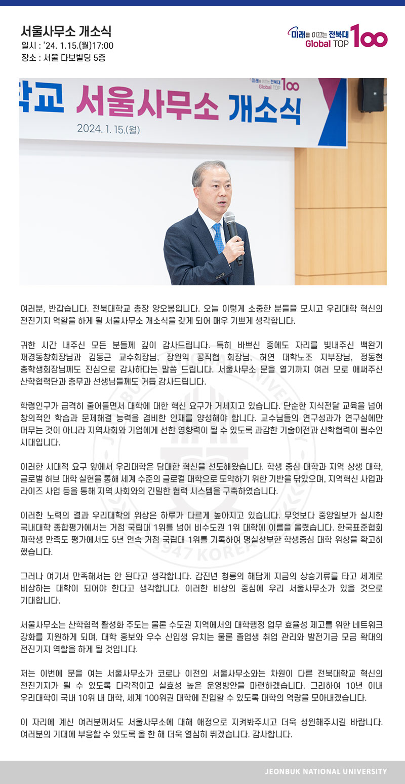 여러분, 반갑습니다. 전북대학교 총장 양오봉입니다. 오늘 이렇게 소중한 분들을 모시고 우리대학 혁신의 전진기지 역할을 하게 될 서울사무소 개소식을 갖게 되어 매우 기쁘게 생각합니다. 귀한 시간 내주신 모든 분들께 깊이 감사드립니다. 특히 바쁘신 중에도 자리를 빛내주신 백완기 재경동창회장님과 김동근 교수회장님, 장원익 공직협 회장님, 허연 대학노조 지부장님, 정동현 총학생회장님께도 진심으로 감사하다는 말씀 드립니다. 서울사무소 문을 열기까지 여러 모로 애써주신 산학협력단과 총무과 선생님들께도 거듭 감사드립니다. 학령인구가 급격히 줄어들면서 대학에 대한 혁신 요구가 거세지고 있습니다. 단순한 지식전달 교육을 넘어 창의적인 학습과 문제해결 능력을 겸비한 인재를 양성해야 합니다. 교수님들의 연구성과가 연구실에만 머무는 것이 아니라 지역사회와 기업에게 선한 영향력이 될 수 있도록 과감한 기술이전과 산학협력이 필수인 시대입니다. 이러한 시대적 요구 앞에서 우리대학은 담대한 혁신을 선도해왔습니다. 학생 중심 대학과 지역 상생 대학, 글로벌 허브 대학 실현을 통해 세계 수준의 글로컬 대학으로 도약하기 위한 기반을 닦았으며, 지역혁신 사업과 라이즈 사업 등을 통해 지역 사회와의 긴밀한 협력 시스템을 구축하였습니다. 이러한 노력의 결과 우리대학의 위상은 하루가 다르게 높아지고 있습니다. 무엇보다 중앙일보가 실시한 국내대학 종합평가에서는 거점 국립대 1위를 넘어 비수도권 1위 대학에 이름을 올렸습니다. 한국표준협회 재학생 만족도 평가에서도 5년 연속 거점 국립대 1위를 기록하여 명실상부한 학생중심 대학 위상을 확고히 했습니다. 그러나 여기서 만족해서는 안 된다고 생각합니다. 갑진년 청룡의 해답게 지금의 상승기류를 타고 세계로 비상하는 대학이 되어야 한다고 생각합니다. 이러한 비상의 중심에 우리 서울사무소가 있을 것으로 기대합니다. 서울사무소는 산학협력 활성화 주도는 물론 수도권 지역에서의 대학행정 업무 효율성 제고를 위한 네트워크 강화를 지원하게 되며, 대학 홍보와 우수 신입생 유치는 물론 졸업생 취업 관리와 발전기금 모금 확대의 전진기지 역할을 하게 될 것입니다. 저는 이번에 문을 여는 서울사무소가 코로나 이전의 서울사무소와는 차원이 다른 전북대학교 혁신의 전진기지가 될 수 있도록 다각적이고 실효성 높은 운영방안을 마련하겠습니다. 그리하여 10년 이내 우리대학이 국내 10위 내 대학, 세계 100위권 대학에 진입할 수 있도록 대학의 역량을 모아내겠습니다. 이 자리에 계신 여러분께서도 서울사무소에 대해 애정으로 지켜봐주시고 더욱 성원해주시길 바랍니다. 여러분의 기대에 부응할 수 있도록 올 한 해 더욱 열심히 뛰겠습니다. 감사합니다.