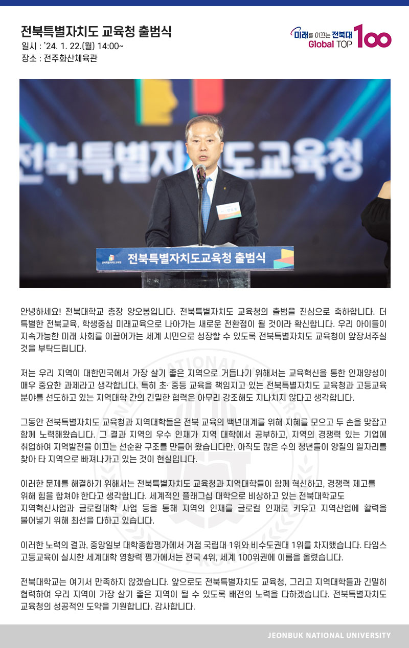 안녕하세요! 전북대학교 총장 양오봉입니다. 전북특별자치도 교육청의 출범을 진심으로 축하합니다. 더 특별한 전북교육, 학생중심 미래교육으로 나아가는 새로운 전환점이 될 것이라 확신합니다. 우리 아이들이 지속가능한 미래 사회를 이끌어가는 세계 시민으로 성장할 수 있도록 전북특별자치도 교육청이 앞장서주실 것을 부탁드립니다. 저는 우리 지역이 대한민국에서 가장 살기 좋은 지역으로 거듭나기 위해서는 교육혁신을 통한 인재양성이 매우 중요한 과제라고 생각합니다. 특히 초․중등 교육을 책임지고 있는 전북특별자치도 교육청과 고등교육 분야를 선도하고 있는 지역대학 간의 긴밀한 협력은 아무리 강조해도 지나치지 않다고 생각합니다. 그동안 전북특별자치도 교육청과 지역대학들은 전북 교육의 백년대계를 위해 지혜를 모으고 두 손을 맞잡고 함께 노력해왔습니다. 그 결과 지역의 우수 인재가 지역 대학에서 공부하고, 지역의 경쟁력 있는 기업에 취업하여 지역발전을 이끄는 선순환 구조를 만들어 왔습니다만, 아직도 많은 수의 청년들이 양질의 일자리를 찾아 타 지역으로 빠져나가고 있는 것이 현실입니다. 이러한 문제를 해결하기 위해서는 전북특별자치도 교육청과 지역대학들이 함께 혁신하고, 경쟁력 제고를 위해 힘을 합쳐야 한다고 생각합니다. 세계적인 플래그십 대학으로 비상하고 있는 전북대학교도 지역혁신사업과 글로컬대학 사업 등을 통해 지역의 인재를 글로컬 인재로 키우고 지역산업에 활력을 불어넣기 위해 최선을 다하고 있습니다. 이러한 노력의 결과, 중앙일보 대학종합평가에서 거점 국립대 1위와 비수도권대 1위를 차지했습니다. 타임스 고등교육이 실시한 세계대학 영향력 평가에서는 전국 4위, 세계 100위권에 이름을 올렸습니다. 전북대학교는 여기서 만족하지 않겠습니다. 앞으로도 전북특별자치도 교육청, 그리고 지역대학들과 긴밀히 협력하여 우리 지역이 가장 살기 좋은 지역이 될 수 있도록 배전의 노력을 다하겠습니다. 전북특별자치도 교육청의 성공적인 도약을 기원합니다. 감사합니다.