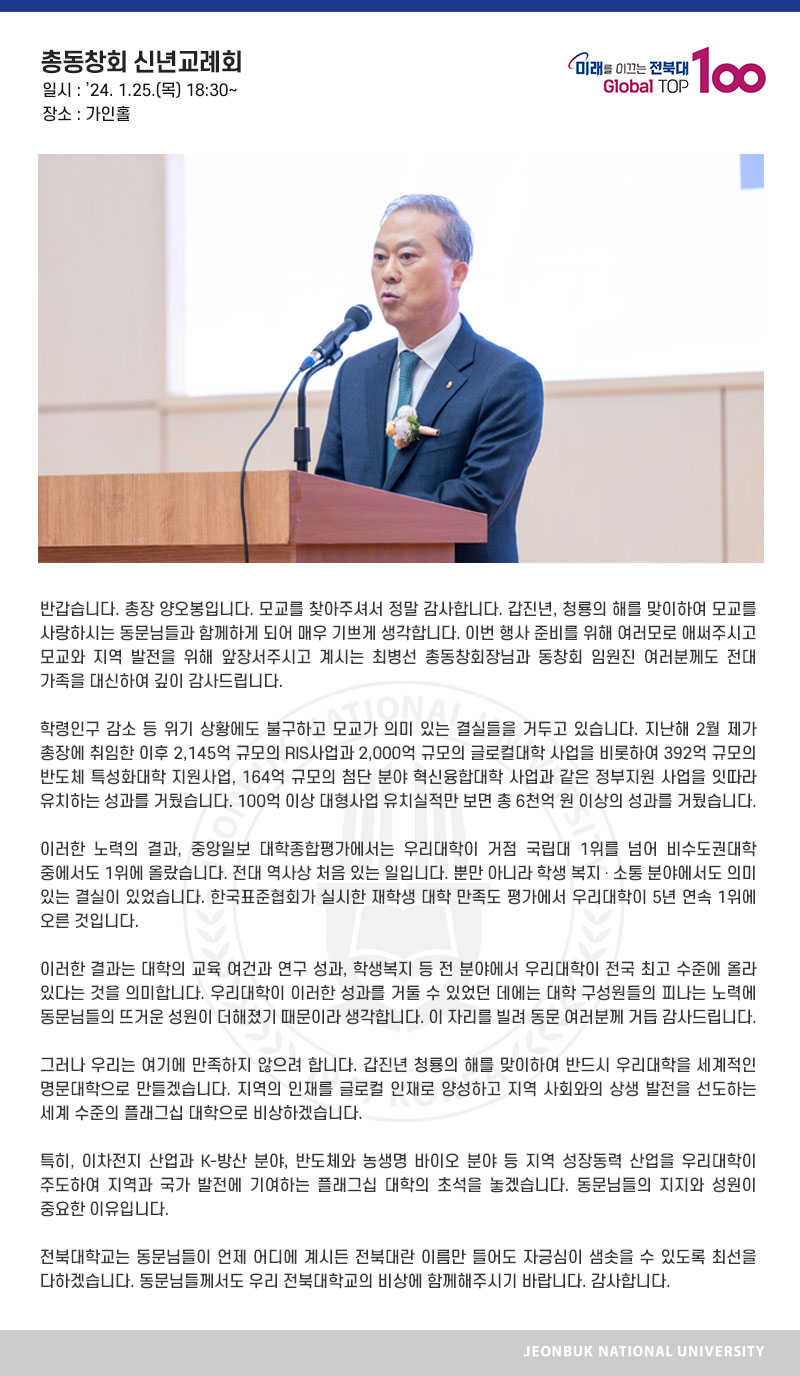반갑습니다. 총장 양오봉입니다. 모교를 찾아주셔서 정말 감사합니다. 갑진년, 청룡의 해를 맞이하여 모교를 사랑하시는 동문님들과 함께하게 되어 매우 기쁘게 생각합니다. 이번 행사 준비를 위해 여러모로 애써주시고 모교와 지역 발전을 위해 앞장서주시고 계시는 최병선 총동창회장님과 동창회 임원진 여러분께도 전대 가족을 대신하여 깊이 감사드립니다. 학령인구 감소 등 위기 상황에도 불구하고 모교가 의미 있는 결실들을 거두고 있습니다. 지난해 2월 제가 총장에 취임한 이후 2,145억 규모의 RIS사업과 2,000억 규모의 글로컬대학 사업을 비롯하여 392억 규모의 반도체 특성화대학 지원사업, 164억 규모의 첨단 분야 혁신융합대학 사업과 같은 정부지원 사업을 잇따라 유치하는 성과를 거뒀습니다. 100억 이상 대형사업 유치실적만 보면 총 6천억 원 이상의 성과를 거뒀습니다. 이러한 노력의 결과, 중앙일보 대학종합평가에서는 우리대학이 거점 국립대 1위를 넘어 비수도권대학 중에서도 1위에 올랐습니다. 전대 역사상 처음 있는 일입니다. 뿐만 아니라 학생 복지․소통 분야에서도 의미 있는 결실이 있었습니다. 한국표준협회가 실시한 재학생 대학 만족도 평가에서 우리대학이 5년 연속 1위에 오른 것입니다. 이러한 결과는 대학의 교육 여건과 연구 성과, 학생복지 등 전 분야에서 우리대학이 전국 최고 수준에 올라 있다는 것을 의미합니다. 우리대학이 이러한 성과를 거둘 수 있었던 데에는 대학 구성원들의 피나는 노력에 동문님들의 뜨거운 성원이 더해졌기 때문이라 생각합니다. 이 자리를 빌려 동문 여러분께 거듭 감사드립니다. 그러나 우리는 여기에 만족하지 않으려 합니다. 갑진년 청룡의 해를 맞이하여 반드시 우리대학을 세계적인 명문대학으로 만들겠습니다. 지역의 인재를 글로컬 인재로 양성하고 지역 사회와의 상생 발전을 선도하는 세계 수준의 플래그십 대학으로 비상하겠습니다. 특히, 이차전지 산업과 K-방산 분야, 반도체와 농생명 바이오 분야 등 지역 성장동력 산업을 우리대학이 주도하여 지역과 국가 발전에 기여하는 플래그십 대학의 초석을 놓겠습니다. 동문님들의 지지와 성원이 중요한 이유입니다. 전북대학교는 동문님들이 언제 어디에 계시든 전북대란 이름만 들어도 자긍심이 샘솟을 수 있도록 최선을 다하겠습니다. 동문님들께서도 우리 전북대학교의 비상에 함께해주시기 바랍니다. 감사합니다.