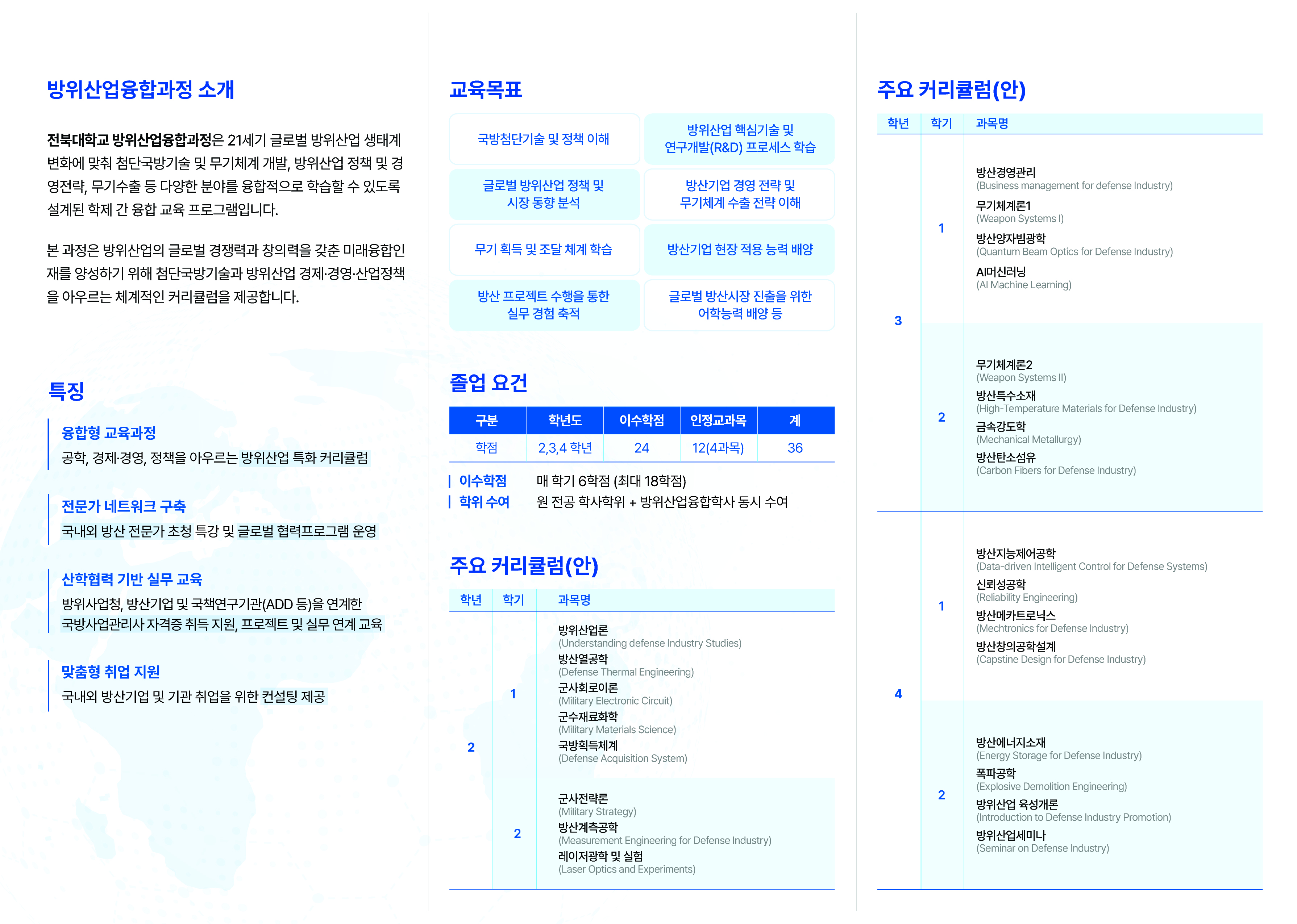 - 36학점 이수: 융합전공 개설교과 24학점(8과목) 이상, 참여학부(과) 인정교과 12학점(4과목)