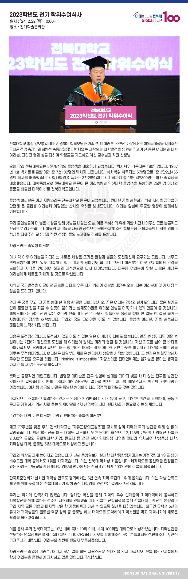 전북대학교 총장 양오봉입니다. 존경하는 학부모님과 가족․친지 여러분, 바쁘신 가운데서도 학위수여식을 빛내주신 두재균 전임 총장님과 최병선 총동창회장님, 변함없는 사랑으로 대학발전을 염원해주고 계신 동문 여러분과 내빈 여러분, 그리고 열과 성을 다하여 학생들을 지도하고 계신 교수님과 직원 선생님! 오늘 우리 전북대학교는 3천784명의 졸업생을 배출하게 되었습니다. 박사학위 취득자는 180명입니다. 1967년 1호 박사를 배출한 이래 총 7천102명의 박사가 나왔습니다. 석사학위 취득자는 578명으로, 총 3만2천455명의 석사를 배출했습니다. 학사학위 취득자는 3천26명입니다. 지금까지 총 19만4천809명의 학사 졸업생을 배출했습니다. 대학통합으로 전북대학교 동문이 된 이리농림과 익산대학 졸업생을 포함하면 25만 명 이상의 동문을 배출한 대학이 바로 전북대학교입니다. 졸업생 여러분은 이제 자랑스러운 전북대학교 동문이 되었습니다. 원대한 꿈을 실현하기 위해 자신을 끊임없이 단련해 온 졸업생 여러분께 아낌없는 찬사와 축하를 보내드립니다. 여러분 앞날에 무궁한 영광이 함께하길 기원합니다. 우리 졸업생들이 더 넓은 세상을 향해 첫발을 내딛는 오늘, 이를 축하하기 위해 귀한 시간 내어주신 모든 분들께도 진심으로 감사드립니다. 아울러 자녀들을 사랑과 정성으로 뒷바라지해 주신 학부모님과 제자들의 미래를 위하여 성심을 다해주신 교수님과 직원 선생님들의 노고에도 경의를 표합니다. 자랑스러운 졸업생 여러분! 이 시각 이후 여러분을 기다리는 새로운 세상은 뜨거운 열정과 불굴의 도전정신이 요구되는 곳입니다. 너무도 변화무쌍하여 한치 앞도 예측하기 힘든 미지의 땅이기도 합니다. 그러나 여러분은 이곳 건지벌에서 인격을 도야하고 지식을 연마하여 최고의 지성인으로 다시 태어났습니다. 때문에 여러분이 맞설 새로운 세상은 여러분에게 새로운 기회가 될 것으로 확신합니다. 지역과 국가발전을 이끌어갈 글로컬 리더로 우뚝 서기 위하여 첫발을 내딛는 오늘, 저는 여러분께 몇 가지 당부 말씀을 드리고자 합니다. 먼저 큰 꿈을 꾸고, 그 꿈을 향해 한 걸음 한 걸음 나아가십시오. 꿈은 여러분 인생의 설계도입니다. 좋은 설계도 없이 훌륭한 집을 지을 수 없듯이 꿈이라는 설계도야말로 여러분 인생을 더욱 가치 있게 만들어 줄 것입니다. 셰익스피어는 꿈은 산과 같은 것이라 했습니다. 산은 아무리 힘들어도 정상을 향해 한 걸음 한 걸음 옮기는 사람에게만 정상을 허락합니다. 우리의 꿈도 그래야만 이룰 수 있습니다. 졸업생 여러분, 꿈을 설정하고 끊임없이 노력하시길 바랍니다. 다음은 도전정신입니다. 도전하지 않고 이룰 수 있는 일은 이 세상 어디에도 없습니다. 일곱 번 넘어지면 여덟 번 일어나는 7전8기 정신으로 도전할 때 여러분이 원하는 미래가 열릴 될 것입니다. 거친 파도를 넘어 큰 바다로 나아가십시오. 우리에게 필요한 배는 항구에만 머무는 배가 아니라 거친 파도를 이겨내고 대양을 누비며 꿈을 이루는 무적함대입니다. 여러분은 내일부터 새로운 환경에서 생활을 시작할 것입니다. 그 환경은 변화무쌍해서 무수한 도전을 요구할 것입니다. ‘Nothing is impossible.’ 자랑스러운 전대인에게는 불가능은 없다는 생각을 가지고 늘 새로운 도전을 하십시오. 셋째는 긍정적인 마인드입니다. 발명왕 에디슨은 전구 실험에 실패할 때마다 빛을 내지 않는 전구를 발견한 것이라고 말했습니다. 천재 과학자 아인슈타인도 밀가루 빵으로 끼니를 때우면서도 최고의 만찬이라고 여겼습니다. 이처럼 성공의 비결은 특별한 환경이 아니라 긍정적 마인드를 갖는 것입니다. 마지막으로 소통하고 협력하는 인재는 언제나 환영받습니다. 더 많이 듣고, 다양한 의견을 교환하며, 공동의 문제를 해결하기 위해 서로 돕는 인재야말로 4차 산업혁명 시대, 현대사회가 필요로 하는 인재입니다. 존경하는 내외 귀빈 여러분! 그리고 친애하는 졸업생 여러분! 개교 77주년을 맞은 우리 전북대학교는 ‘자유․정의․창조’를 교시로 삼아 지역과 국가 발전을 위해 쉼 없이 달려왔습니다. 최근에는 전국 어느 대학도 시도하지 못한 담대한 혁신으로 2,145억 규모의 지역혁신 사업과 2,000억 규모의 글로컬대학 사업, 반도체 등 첨단 분야 인재양성 사업을 잇따라 유치하여 학생중심 대학, 지역상생 대학, 글로벌 허브 대학으로 비상하고 있습니다. 우리의 위상도 크게 높아지고 있습니다. 지난해 중앙일보가 실시한 대학종합평가에서는 거점국립대 1위를 넘어 비수도권 대학 중에서도 1위를 차지했습니다. 이는 전북대 역사상 처음입니다. 세계적으로 공신력을 인정받고 있는 타임스 고등교육의 세계대학 영향력 평가에서는 전국 4위, 세계 100위권에 이름을 올렸습니다. 한국표준협회가 실시한 재학생 만족도 평가에서는 5년 연속 지역 국립대 1위에 올랐습니다. 이는 학생 만족도 제고를 위해 노력해 온 전북대학교가 학생 중심 대학임을 인정받은 결과라고 생각합니다. 우리는 여기에 만족하지 않겠습니다. 담대한 혁신을 통해 지역의 우수 인재들이 지역대학에서 공부하고 지역발전을 위해 일하