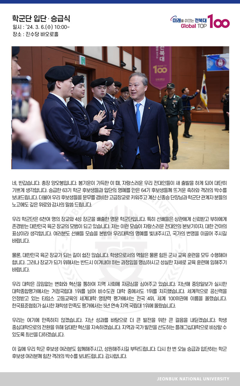 네, 반갑습니다. 총장 양오봉입니다. 봄기운이 가득한 이 때, 자랑스러운 우리 전대인들이 새 출발을 하게 되어 대단히 기쁘게 생각합니다. 승급한 63기 학군 후보생들과 입단의 영예를 안은 64기 후보생들께 뜨거운 축하와 격려의 박수를 보내드립니다. 더불어 우리 후보생들을 문무를 겸비한 고급장교로 키워주고 계신 신종승 단장님과 학군단 관계자 분들의 노고에도 깊은 위로와 감사의 말씀 드립니다. 우리 학군단은 6천여 명의 장교와 4성 장군을 배출한 명문 학군단입니다. 특히 선배들은 상관에게 신뢰받고 부하에게 존경받는 대한민국 육군 장교의 모범이 되고 있습니다. 저는 이런 모습이 자랑스러운 전대인의 본보기이자, 대한 건아의 표상이라 생각합니다. 여러분도 선배들 모습을 본받아 우리대학의 명예를 빛내주시고, 국가의 번영을 이끌어 주시길 바랍니다. 물론, 대한민국 육군 장교가 되는 길이 쉽진 않습니다. 학생으로서의 역할은 물론 힘든 군사 교육 훈련을 모두 수행해야 합니다. 그러나 장교가 되기 위해서는 반드시 이겨내야 하는 과정임을 명심하시고 성실한 자세로 교육 훈련에 임해주기 바랍니다. 우리 대학은 끊임없는 변화와 혁신을 통하여 지역 사회에 자긍심을 심어주고 있습니다. 지난해 중앙일보가 실시한 대학종합평가에서는 거점국립대 1위를 넘어 비수도권 대학 중에서도 1위를 차지했습니다. 세계적으로 공신력을 인정받고 있는 타임스 고등교육의 세계대학 영향력 평가에서는 전국 4위, 세계 100위권에 이름을 올렸습니다. 한국표준협회가 실시한 재학생 만족도 평가에서는 5년 연속 지역 국립대 1위에 올랐습니다. 우리는 여기에 만족하지 않겠습니다. 지난 성과를 바탕으로 더 큰 발전을 위한 큰 걸음을 내딛겠습니다. 학생 중심대학으로의 전환을 위해 담대한 혁신을 지속하겠습니다. 지역과 국가 발전을 선도하는 플래그십대학으로 비상할 수 있도록 최선을 다하겠습니다. 이 길에 우리 학군 후보생 여러분도 함께해주시고, 성원해주시길 부탁드립니다. 다시 한 번 오늘 승급과 입단하는 학군 후보생 여러분께 힘찬 격려의 박수를 보내드립니다. 감사합니다.