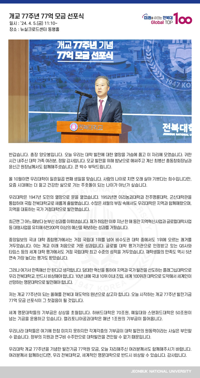 반갑습니다. 총장 양오봉입니다. 오늘 우리는 대학 발전에 대한 열망을 가슴에 품고 이 자리에 모였습니다. 귀한 시간 내주신 대학 가족 여러분, 정말 감사합니다. 모교 발전을 위해 밤낮으로 애써주고 계신 최병선 총동창회장님과 윤신근 원장님께서도 함께해주셨습니다. 큰 박수 부탁드립니다. 올 10월이면 우리대학이 일흔일곱 번째 생일을 맞습니다. 사람의 나이로 치면 오래 살아 기쁘다는 희수입니다만, 요즘 시대에는 더 젊고 건강한 삶으로 가는 주춧돌이 되는 나이가 아닌가 싶습니다. 우리대학은 1947년 도민의 열망으로 문을 열었습니다. 1952년엔 이리농과대학과 전주명륜대학, 군산대학관을 통합하여 국립 전북대학교로 새롭게 출발했습니다. 수많은 세월의 부침 속에서도 우리대학은 지역과 함께해왔으며, 지역을 대표하는 국가 거점대학으로 발전했습니다. 최근엔 그 어느 때보다 눈부신 성과를 이뤄냈습니다. 제가 취임한 이후 지난 한 해 동안 지역혁신사업과 글로컬대학사업 등 대형사업을 유치해 6천200억 이상의 예산을 확보하는 성과를 거뒀습니다. 중앙일보의 국내 대학 종합평가에서는 거점 국립대 1위를 넘어 비수도권 대학 중에서도 1위에 오르는 쾌거를 거두었습니다. 이는 개교 이래 처음으로 거둔 성과입니다. 글로벌 대학 평가기관으로 인정받고 있는 QS사와 타임스 등의 세계 대학 평가에서도 거점 국립대학 최고 수준의 성적을 거두었습니다. 재학생들의 만족도 역시 5년 연속 가장 높다는 평가도 받았습니다. 그러나 여기서 만족해선 안 된다고 생각합니다. 담대한 혁신을 통하여 지역과 국가 발전을 선도하는 플래그십대학으로 우리 전북대학교, 반드시 비상해야 합니다. 10년 내에 국내 10위 이내 진입, 세계 100위권 대학으로 도약해서 세계인이 선망하는 명문대학으로 발전해야 합니다. 저는 개교 77주년이 되는 올해를 전북대 재도약의 원년으로 삼고자 합니다. 오늘 시작하는 개교 77주년 발전기금 77억 모금 선포식이 그 첫걸음이 될 것입니다. 세계 명문대학들의 기부금은 상상을 초월합니다. 하버드대학은 70조원, 예일대와 스탠퍼드대학은 50조원이 넘는 기금을 운용하고 있습니다. 캘리포니아공과대학은 매년 1조원의 기부금이 들어옵니다. 우리나라 대학들은 여기에 한참 미치지 못하지만 각계각층의 기부금이 대학 발전의 원동력이라는 사실은 부인할 수 없습니다. 정부의 지원과 연구비 수주만으로 대학발전을 견인할 수 없기 때문입니다. 우리대학 개교 77주년을 기념한 발전기금 77억원 모금, 오늘 자리해주신 여러분께서도 함께해주시기 바랍니다. 여러분께서 함께하신다면, 우리 전북대학교, 세계적인 명문대학으로 반드시 비상할 수 있습니다. 감사합니다.