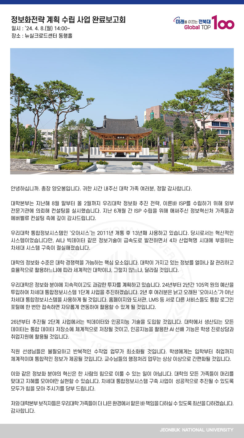 안녕하십니까. 총장 양오봉입니다. 귀한 시간 내주신 대학 가족 여러분, 정말 감사합니다. 대학본부는 지난해 8월 말부터 올 2월까지 우리대학 정보화 추진 전략, 이른바 ISP를 수립하기 위해 외부 전문기관에 의뢰해 컨설팅을 실시했습니다. 지난 6개월 간 ISP 수립을 위해 애써주신 정보혁신처 가족들과 에버벨류 컨설팅 측에 깊이 감사드립니다. 우리대학 통합정보시스템인 ‘오아시스’는 2011년 개통 후 13년째 사용하고 있습니다. 당시로서는 혁신적인 시스템이었습니다만, AI나 빅데이터 같은 정보기술이 급속도로 발전하면서 4차 산업혁명 시대에 부응하는 차세대 시스템 구축이 절실해졌습니다. 대학의 정보화 수준은 대학 경쟁력을 가늠하는 핵심 요소입니다. 대학이 가지고 있는 정보를 얼마나 잘 관리하고 효율적으로 활용하느냐에 따라 세계적인 대학이냐, 그렇지 않느냐, 달라질 것입니다. 우리대학은 정보화 분야에 지속적이고도 과감한 투자를 계획하고 있습니다. 24년부터 2년간 105억 원의 예산을 투입하여 차세대 통합정보시스템 1단계 사업을 추진하겠습니다. 2년 후 여러분은 낡고 오래된 ‘오아시스’가 아닌 차세대 통합정보시스템을 사용하게 될 것입니다. 홈페이지와 도서관, LMS 등 서로 다른 서비스들도 통합 로그인 포털에 한 번만 접속하면 자유롭게 연동하여 활용할 수 있게 될 것입니다. 26년부터 추진될 2단계 사업에서는 빅데이터와 인공지능 기술을 도입할 것입니다. 대학에서 생산되는 모든 데이터는 통합 데이터 저장소에 체계적으로 저장될 것이고, 인공지능을 활용한 AI 선배 기능은 학생 진로상담과 취업지원에 활용될 것입니다. 직원 선생님들은 불필요하고 반복적인 수작업 업무가 최소화될 것입니다. 학생에게는 입학부터 취업까지 체계적이며 통합적인 정보가 제공될 것입니다. 교수님들의 행정처리 업무는 상상 이상으로 간편화될 것입니다. 이와 같은 정보화 분야의 혁신은 한 사람의 힘으로 이룰 수 있는 일이 아닙니다. 대학의 모든 가족들이 머리를 맞대고 지혜를 모아야만 실현할 수 있습니다. 차세대 통합정보시스템 구축 사업이 성공적으로 추진될 수 있도록 모두가 힘을 모아 주시기를 당부 드립니다. 저와 대학본부 보직자들은 우리대학 가족들이 더 나은 환경에서 맡은 바 책임을 다하실 수 있도록 최선을 다하겠습니다. 감사합니다.