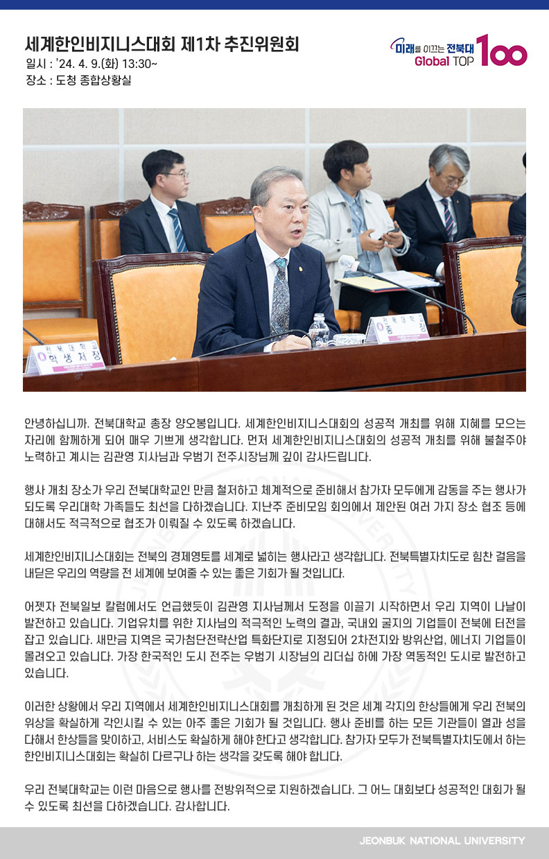 우리 전북대학교는 이런 마음으로 행사를 전방위적으로 지원하겠습니다. 그 어느 대회보다 성공적인 대회가 될 수 있도록 최