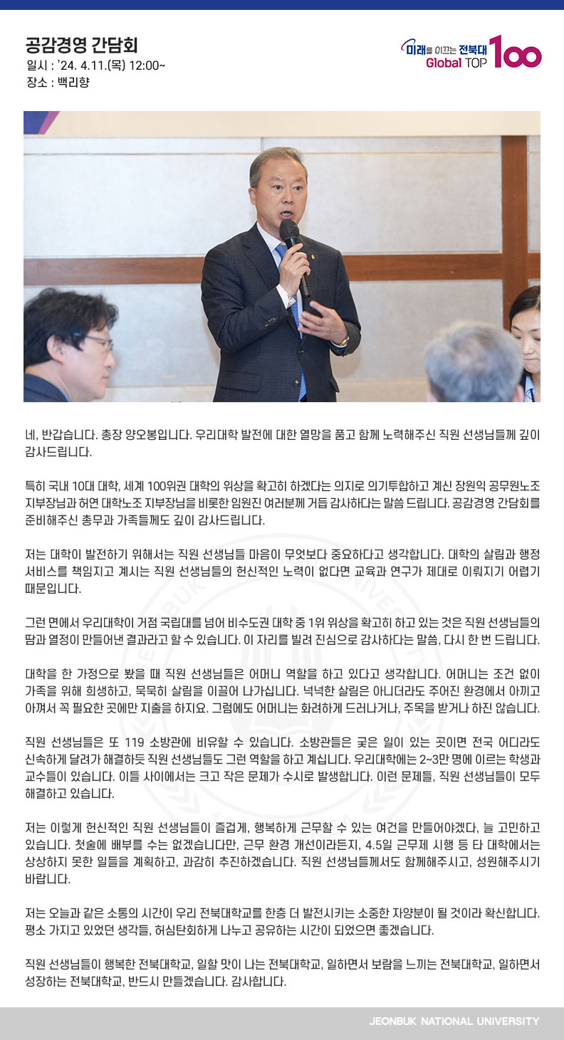 네, 반갑습니다. 총장 양오봉입니다. 우리대학 발전에 대한 열망을 품고 함께 노력해주신 직원 선생님들께 깊이 감사드립니다. 특히 국내 10대 대학, 세계 100위권 대학의 위상을 확고히 하겠다는 의지로 의기투합하고 계신 장원익 공무원노조 지부장님과 허연 대학노조 지부장님을 비롯한 임원진 여러분께 거듭 감사하다는 말씀 드립니다. 공감경영 간담회를 준비해주신 총무과 가족들께도 깊이 감사드립니다. 저는 대학이 발전하기 위해서는 직원 선생님들 마음이 무엇보다 중요하다고 생각합니다. 대학의 살림과 행정 서비스를 책임지고 계시는 직원 선생님들의 헌신적인 노력이 없다면 교육과 연구가 제대로 이뤄지기 어렵기 때문입니다. 그런 면에서 우리대학이 거점 국립대를 넘어 비수도권 대학 중 1위 위상을 확고히 하고 있는 것은 직원 선생님들의 땀과 열정이 만들어낸 결과라고 할 수 있습니다. 이 자리를 빌려 진심으로 감사하다는 말씀, 다시 한 번 드립니다. 대학을 한 가정으로 봤을 때 직원 선생님들은 어머니 역할을 하고 있다고 생각합니다. 어머니는 조건 없이 가족을 위해 희생하고, 묵묵히 살림을 이끌어 나가십니다. 넉넉한 살림은 아니더라도 주어진 환경에서 아끼고 아껴서 꼭 필요한 곳에만 지출을 하지요. 그럼에도 어머니는 화려하게 드러나거나, 주목을 받거나 하진 않습니다. 직원 선생님들은 또 119 소방관에 비유할 수 있습니다. 소방관들은 궂은 일이 있는 곳이면 전국 어디라도 신속하게 달려가 해결하듯 직원 선생님들도 그런 역할을 하고 계십니다. 우리대학에는 2~3만 명에 이르는 학생과 교수들이 있습니다. 이들 사이에서는 크고 작은 문제가 수시로 발생합니다. 이런 문제들, 직원 선생님들이 모두 해결하고 있습니다. 저는 이렇게 헌신적인 직원 선생님들이 즐겁게, 행복하게 근무할 수 있는 여건을 만들어야겠다, 늘 고민하고 있습니다. 첫술에 배부를 수는 없겠습니다만, 근무 환경 개선이라든지, 4.5일 근무제 시행 등 타 대학에서는 상상하지 못한 일들을 계획하고, 과감히 추진하겠습니다. 직원 선생님들께서도 함께해주시고, 성원해주시기 바랍니다. 저는 오늘과 같은 소통의 시간이 우리 전북대학교를 한층 더 발전시키는 소중한 자양분이 될 것이라 확신합니다. 평소 가지고 있었던 생각들, 허심탄회하게 나누고 공유하는 시간이 되었으면 좋겠습니다. 직원 선생님들이 행복한 전북대학교, 일할 맛이 나는 전북대학교, 일하면서 보람을 느끼는 전북대학교, 일하면서 성장하는 전북대학교, 반드시 만들겠습니다. 감사합니다.