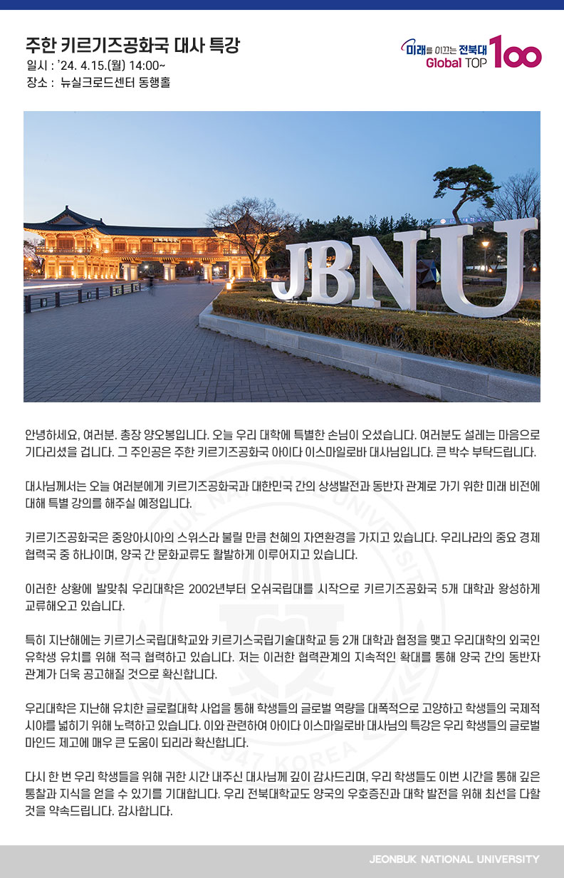 안녕하세요, 여러분. 총장 양오봉입니다. 오늘 우리 대학에 특별한 손님이 오셨습니다. 여러분도 설레는 마음으로 기다리셨을 겁니다. 그 주인공은 주한 키르기즈공화국 아이다 이스마일로바 대사님입니다. 큰 박수 부탁드립니다. 대사님께서는 오늘 여러분에게 키르기즈공화국과 대한민국 간의 상생발전과 동반자 관계로 가기 위한 미래 비전에 대해 특별 강의를 해주실 예정입니다. 키르기즈공화국은 중앙아시아의 스위스라 불릴 만큼 천혜의 자연환경을 가지고 있습니다. 우리나라의 중요 경제 협력국 중 하나이며, 양국 간 문화교류도 활발하게 이루어지고 있습니다. 이러한 상황에 발맞춰 우리대학은 2002년부터 오쉬국립대를 시작으로 키르기즈공화국 5개 대학과 왕성하게 교류해오고 있습니다. 특히 지난해에는 키르기스국립대학교와 키르기스국립기술대학교 등 2개 대학과 협정을 맺고 우리대학의 외국인 유학생 유치를 위해 적극 협력하고 있습니다. 저는 이러한 협력관계의 지속적인 확대를 통해 양국 간의 동반자 관계가 더욱 공고해질 것으로 확신합니다. 우리대학은 지난해 유치한 글로컬대학 사업을 통해 학생들의 글로벌 역량을 대폭적으로 고양하고 학생들의 국제적 시야를 넓히기 위해 노력하고 있습니다. 이와 관련하여 아이다 이스마일로바 대사님의 특강은 우리 학생들의 글로벌 마인드 제고에 매우 큰 도움이 되리라 확신합니다. 다시 한 번 우리 학생들을 위해 귀한 시간 내주신 대사님께 깊이 감사드리며, 우리 학생들도 이번 시간을 통해 깊은 통찰과 지식을 얻을 수 있기를 기대합니다. 우리 전북대학교도 양국의 우호증진과 대학 발전을 위해 최선을 다할 것을 약속드립니다. 감사합니다.