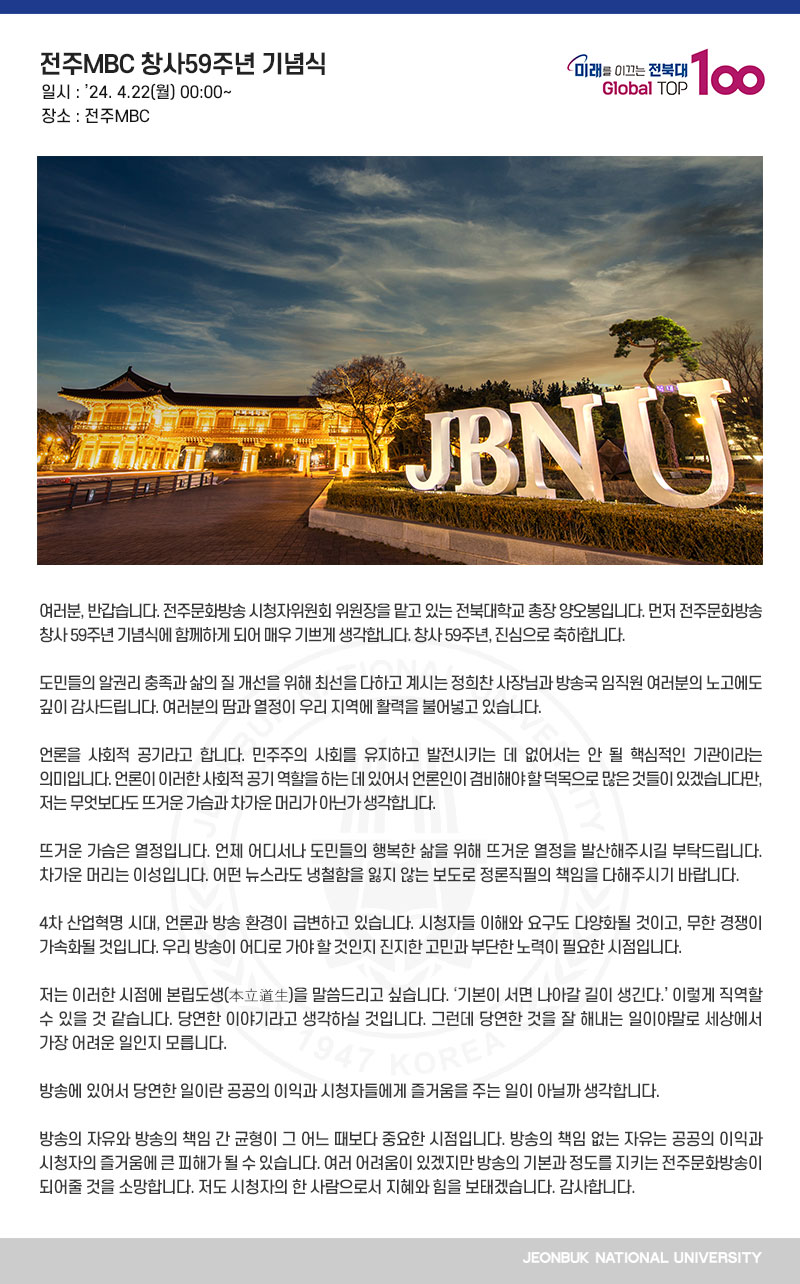 여러분, 반갑습니다. 전주문화방송 시청자위원회 위원장을 맡고 있는 전북대학교 총장 양오봉입니다. 먼저 전주문화방송 창사 59주년 기념식에 함께하게 되어 매우 기쁘게 생각합니다. 창사 59주년, 진심으로 축하합니다.