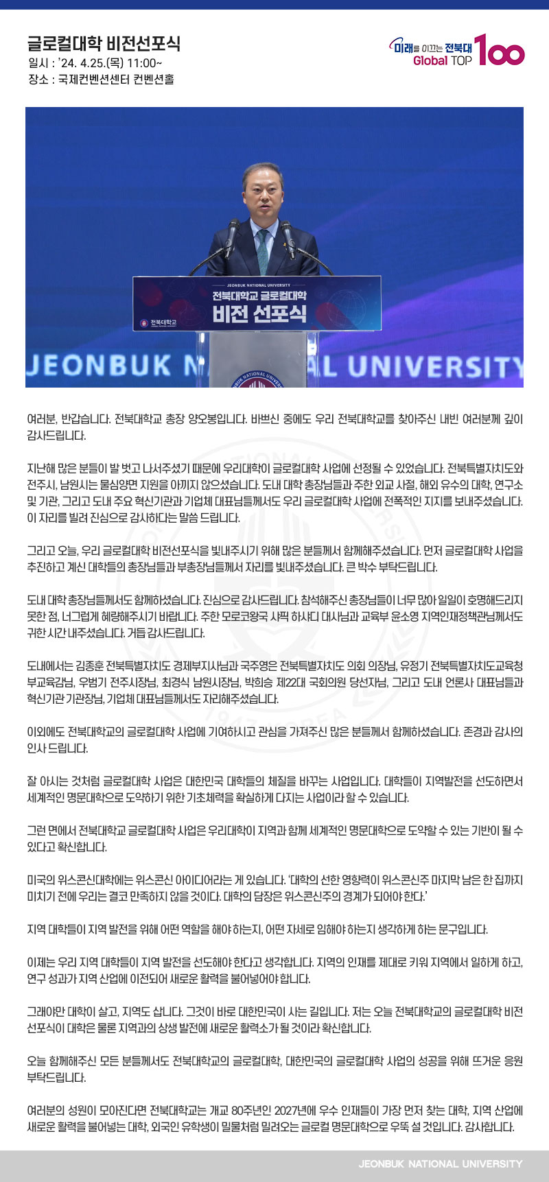 여러분, 반갑습니다. 전북대학교 총장 양오봉입니다. 바쁘신 중에도 우리 전북대학교를 찾아주신 내빈 여러분께 깊이 감사드립니다. 지난해 많은 분들이 발 벗고 나서주셨기 때문에 우리대학이 글로컬대학 사업에 선정될 수 있었습니다. 전북특별자치도와 전주시, 남원시는 물심양면 지원을 아끼지 않으셨습니다. 도내 대학 총장님들과 주한 외교 사절, 해외 유수의 대학, 연구소 및 기관, 그리고 도내 주요 혁신기관과 기업체 대표님들께서도 우리 글로컬대학 사업에 전폭적인 지지를 보내주셨습니다. 이 자리를 빌려 진심으로 감사하다는 말씀 드립니다. 그리고 오늘, 우리 글로컬대학 비전선포식을 빛내주시기 위해 많은 분들께서 함께해주셨습니다. 먼저 글로컬대학 사업을 추진하고 계신 대학들의 총장님들과 부총장님들께서 자리를 빛내주셨습니다. 큰 박수 부탁드립니다. 도내 대학 총장님들께서도 함께하셨습니다. 진심으로 감사드립니다. 참석해주신 총장님들이 너무 많아 일일이 호명해드리지 못한 점, 너그럽게 혜량해주시기 바랍니다. 주한 모로코왕국 샤픽 하샤디 대사님과 교육부 윤소영 지역인재정책관님께서도 귀한 시간 내주셨습니다. 거듭 감사드립니다. 도내에서는 김종훈 전북특별자치도 경제부지사님과 국주영은 전북특별자치도 의회 의장님, 유정기 전북특별자치도교육청 부교육감님, 우범기 전주시장님, 최경식 남원시장님, 박희승 제22대 국회의원 당선자님, 그리고 도내 언론사 대표님들과 혁신기관 기관장님, 기업체 대표님들께서도 자리해주셨습니다. 이외에도 전북대학교의 글로컬대학 사업에 기여하시고 관심을 가져주신 많은 분들께서 함께하셨습니다. 존경과 감사의 인사 드립니다. 잘 아시는 것처럼 글로컬대학 사업은 대한민국 대학들의 체질을 바꾸는 사업입니다. 대학들이 지역발전을 선도하면서 세계적인 명문대학으로 도약하기 위한 기초체력을 확실하게 다지는 사업이라 할 수 있습니다. 그런 면에서 전북대학교 글로컬대학 사업은 우리대학이 지역과 함께 세계적인 명문대학으로 도약할 수 있는 기반이 될 수 있다고 확신합니다. 미국의 위스콘신대학에는 위스콘신 아이디어라는 게 있습니다. ‘대학의 선한 영향력이 위스콘신주 마지막 남은 한 집까지 미치기 전에 우리는 결코 만족하지 않을 것이다. 대학의 담장은 위스콘신주의 경계가 되어야 한다.’ 지역 대학들이 지역 발전을 위해 어떤 역할을 해야 하는지, 어떤 자세로 임해야 하는지 생각하게 하는 문구입니다. 이제는 우리 지역 대학들이 지역 발전을 선도해야 한다고 생각합니다. 지역의 인재를 제대로 키워 지역에서 일하게 하고, 연구 성과가 지역 산업에 이전되어 새로운 활력을 불어넣어야 합니다. 그래야만 대학이 살고, 지역도 삽니다. 그것이 바로 대한민국이 사는 길입니다. 저는 오늘 전북대학교의 글로컬대학 비전 선포식이 대학은 물론 지역과의 상생 발전에 새로운 활력소가 될 것이라 확신합니다. 오늘 함께해주신 모든 분들께서도 전북대학교의 글로컬대학, 대한민국의 글로컬대학 사업의 성공을 위해 뜨거운 응원 부탁드립니다. 여러분의 성원이 모아진다면 전북대학교는 개교 80주년인 2027년에 우수 인재들이 가장 먼저 찾는 대학, 지역 산업에 새로운 활력을 불어넣는 대학, 외국인 유학생이 밀물처럼 밀려오는 글로컬 명문대학으로 우뚝 설 것입니다. 감사합니다.
