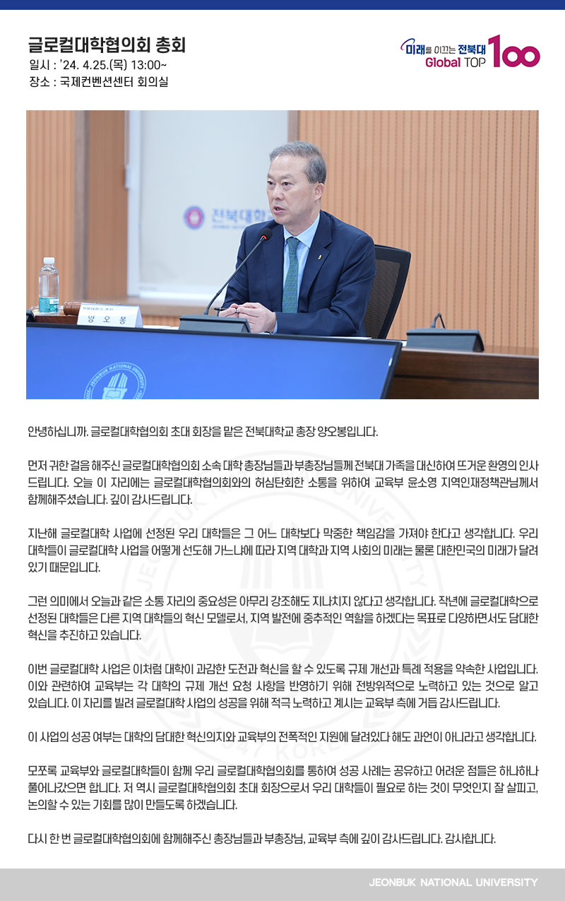 안녕하십니까. 글로컬대학협의회 초대 회장을 맡은 전북대학교 총장 양오봉입니다. 먼저 귀한 걸음 해주신 글로컬대학협의회 소속 대학 총장님들과 부총장님들께 전북대 가족을 대신하여 뜨거운 환영의 인사 드립니다. 오늘 이 자리에는 글로컬대학협의회와의 허심탄회한 소통을 위하여 교육부 윤소영 지역인재정책관님께서 함께해주셨습니다. 깊이 감사드립니다. 지난해 글로컬대학 사업에 선정된 우리 대학들은 그 어느 대학보다 막중한 책임감을 가져야 한다고 생각합니다. 우리 대학들이 글로컬대학 사업을 어떻게 선도해 가느냐에 따라 지역 대학과 지역 사회의 미래는 물론 대한민국의 미래가 달려 있기 때문입니다. 그런 의미에서 오늘과 같은 소통 자리의 중요성은 아무리 강조해도 지나치지 않다고 생각합니다. 작년에 글로컬대학으로 선정된 대학들은 다른 지역 대학들의 혁신 모델로서, 지역 발전에 중추적인 역할을 하겠다는 목표로 다양하면서도 담대한 혁신을 추진하고 있습니다. 이번 글로컬대학 사업은 이처럼 대학이 과감한 도전과 혁신을 할 수 있도록 규제 개선과 특례 적용을 약속한 사업입니다. 이와 관련하여 교육부는 각 대학의 규제 개선 요청 사항을 반영하기 위해 전방위적으로 노력하고 있는 것으로 알고 있습니다. 이 자리를 빌려 글로컬대학 사업의 성공을 위해 적극 노력하고 계시는 교육부 측에 거듭 감사드립니다. 이 사업의 성공 여부는 대학의 담대한 혁신의지와 교육부의 전폭적인 지원에 달려있다 해도 과언이 아니라고 생각합니다. 모쪼록 교육부와 글로컬대학들이 함께 우리 글로컬대학협의회를 통하여 성공 사례는 공유하고 어려운 점들은 하나하나 풀어나갔으면 합니다. 저 역시 글로컬대학협의회 초대 회장으로서 우리 대학들이 필요로 하는 것이 무엇인지 잘 살피고, 논의할 수 있는 기회를 많이 만들도록 하겠습니다. 다시 한 번 글로컬대학협의회에 함께해주신 총장님들과 부총장님, 교육부 측에 깊이 감사드립니다. 감사합니다.