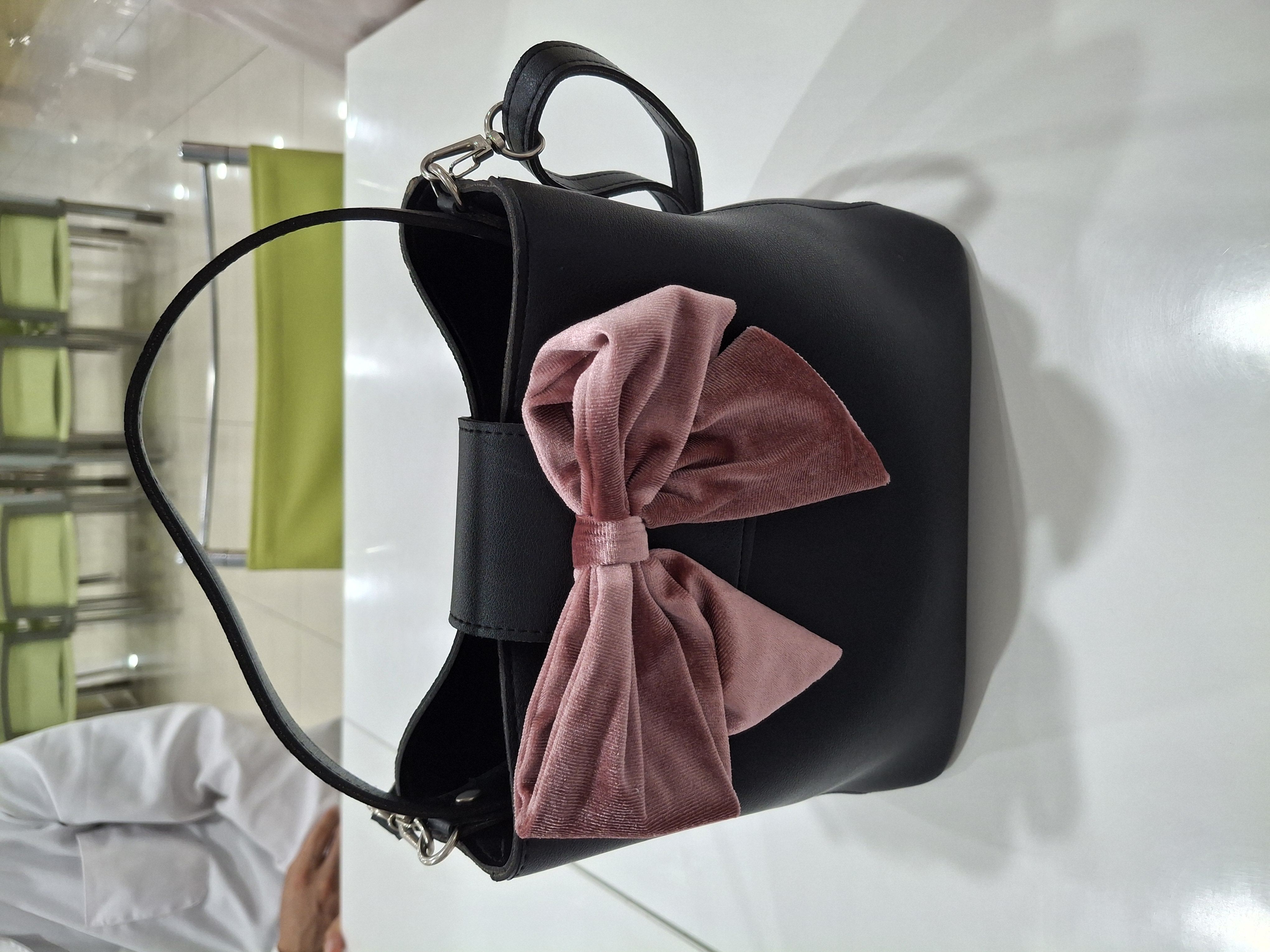 벨벳 재질의 분홍색 리본이 달린 검은 가죽 가방