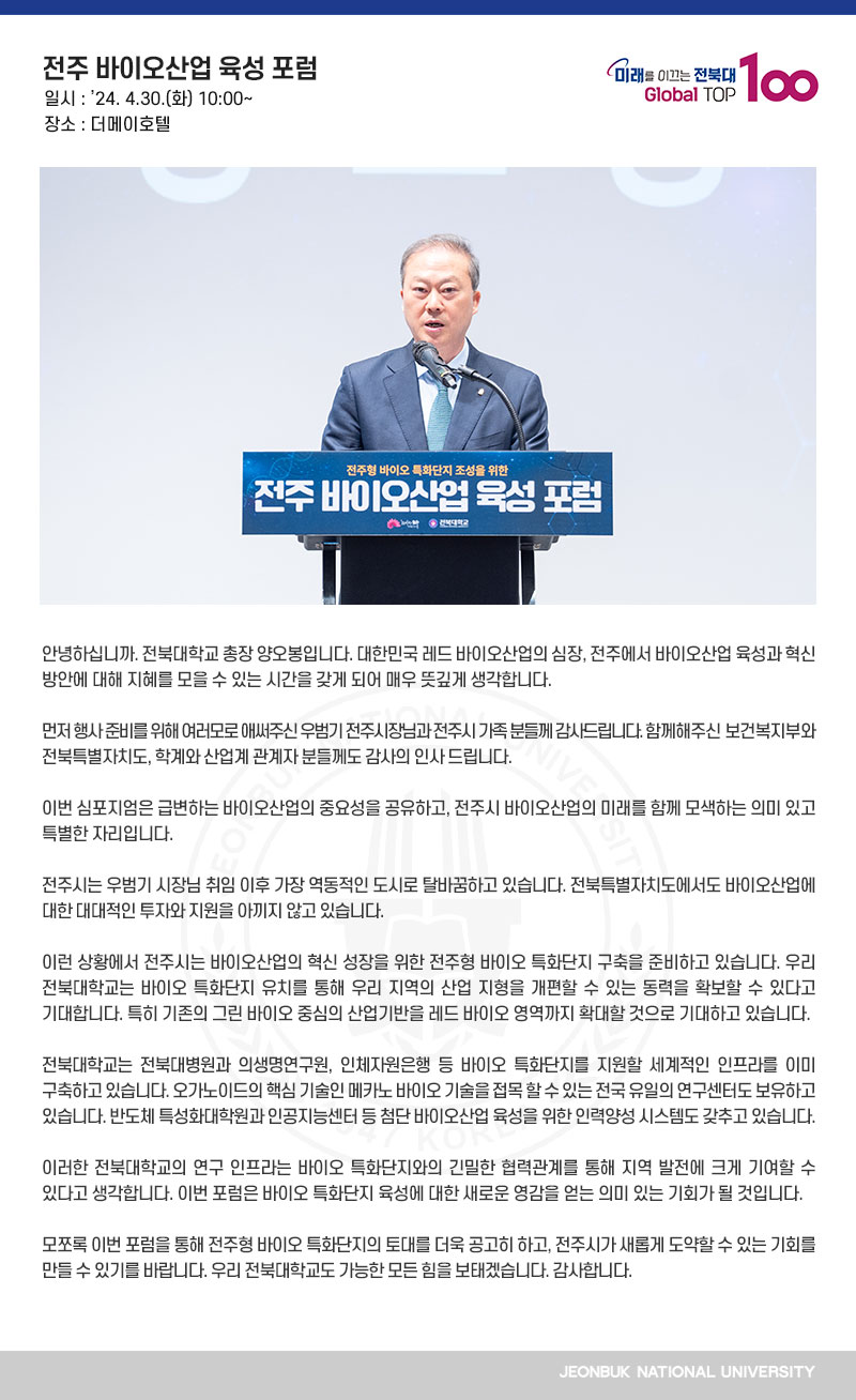 모쪼록 이번 포럼을 통해 전주형 바이오 특화단지의 토대를 더욱 공고히 하고, 전주시가 새롭게 도약할 수 있는 기회를 만들 수 있기를 바랍니다. 우리 전북대학교도 가능한 모든 힘을 보태겠습니다. 감사합니다.