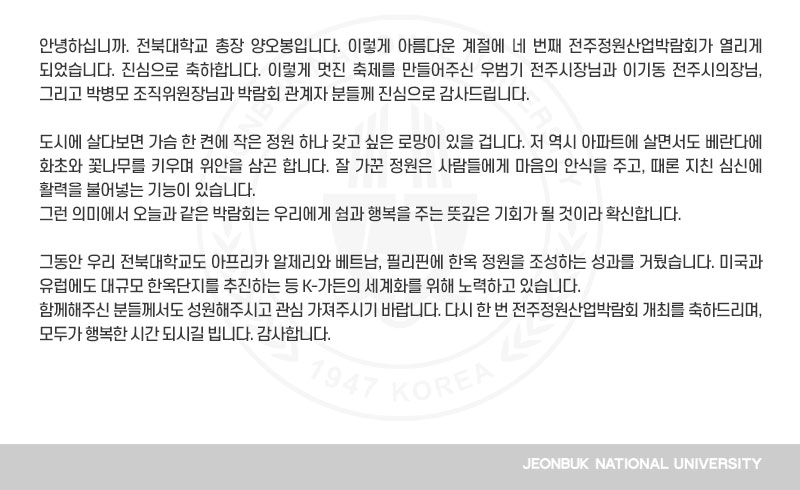 안녕하십니까. 전북대학교 총장 양오봉입니다. 이렇게 아름다운 계절에 네 번째 전주정원산업박람회가 열리게 되었습니다. 진심으로 축하합니다. 이렇게 멋진 축제를 만들어주신 우범기 전주시장님과 이기동 전주시의장님, 그리고 박병모 조직위원장님과 박람회 관계자 분들께 진심으로 감사드립니다. 도시에 살다보면 가슴 한 켠에 작은 정원 하나 갖고 싶은 로망이 있을 겁니다. 저 역시 아파트에 살면서도 베란다에 화초와 꽃나무를 키우며 위안을 삼곤 합니다. 잘 가꾼 정원은 사람들에게 마음의 안식을 주고, 때론 지친 심신에 활력을 불어넣는 기능이 있습니다. 그런 의미에서 오늘과 같은 박람회는 우리에게 쉼과 행복을 주는 뜻깊은 기회가 될 것이라 확신합니다. 그동안 우리 전북대학교도 아프리카 알제리와 베트남, 필리핀에 한옥 정원을 조성하는 성과를 거뒀습니다. 미국과 유럽에도 대규모 한옥단지를 추진하는 등 K-가든의 세계화를 위해 노력하고 있습니다. 함께해주신 분들께서도 성원해주시고 관심 가져주시기 바랍니다. 다시 한 번 전주정원산업박람회 개최를 축하드리며, 모두가 행복한 시간 되시길 빕니다. 감사합니다.