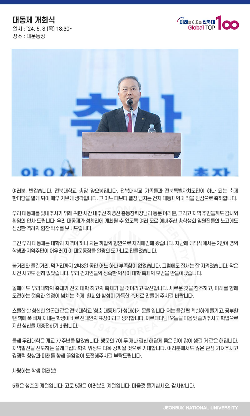여러분, 반갑습니다. 전북대학교 총장 양오봉입니다. 전북대학교 가족들과 전북특별자치도민이 하나 되는 축제 한마당을 열게 되어 매우 기쁘게 생각합니다. 그 어느 때보다 열정 넘치는 건지 대동제의 개막을 진심으로 축하합니다.