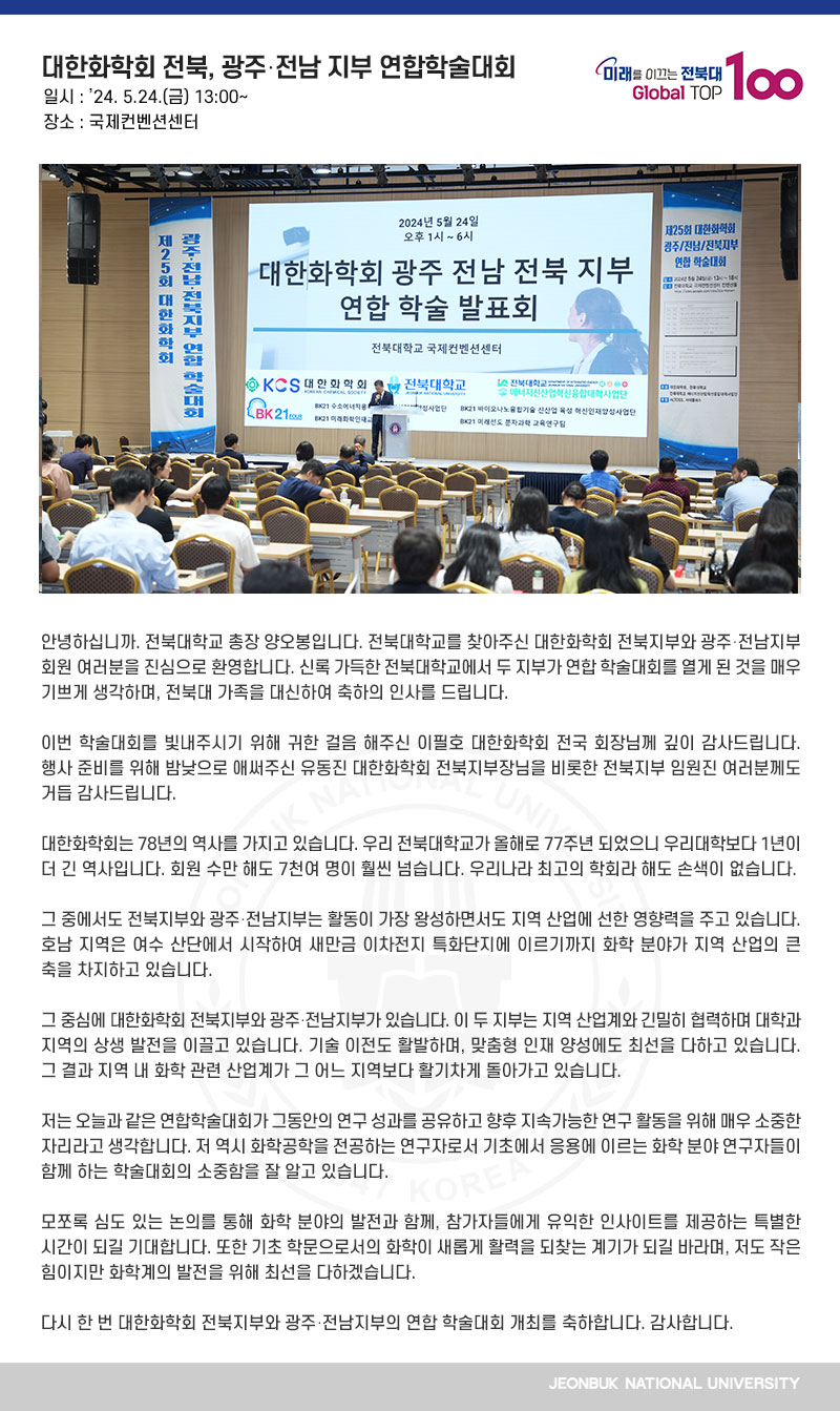 안녕하십니까. 전북대학교 총장 양오봉입니다. 전북대학교를 찾아주신 대한화학회 전북지부와 광주․전남지부 회원 여러분을 진심으로 환영합니다. 신록 가득한 전북대학교에서 두 지부가 연합 학술대회를 열게 된 것을 매우 기쁘게 생각하며, 전북대 가족을 대신하여 축하의 인사를 드립니다. 이번 학술대회를 빛내주시기 위해 귀한 걸음 해주신 이필호 대한화학회 전국 회장님께 깊이 감사드립니다. 행사 준비를 위해 밤낮으로 애써주신 유동진 대한화학회 전북지부장님을 비롯한 전북지부 임원진 여러분께도 거듭 감사드립니다. 대한화학회는 78년의 역사를 가지고 있습니다. 우리 전북대학교가 올해로 77주년 되었으니 우리대학보다 1년이 더 긴 역사입니다. 회원 수만 해도 7천여 명이 훨씬 넘습니다. 우리나라 최고의 학회라 해도 손색이 없습니다. 그 중에서도 전북지부와 광주․전남지부는 활동이 가장 왕성하면서도 지역 산업에 선한 영향력을 주고 있습니다. 호남 지역은 여수 산단에서 시작하여 새만금 이차전지 특화단지에 이르기까지 화학 분야가 지역 산업의 큰 축을 차지하고 있습니다. 그 중심에 대한화학회 전북지부와 광주․전남지부가 있습니다. 이 두 지부는 지역 산업계와 긴밀히 협력하며 대학과 지역의 상생 발전을 이끌고 있습니다. 기술 이전도 활발하며, 맞춤형 인재 양성에도 최선을 다하고 있습니다. 그 결과 지역 내 화학 관련 산업계가 그 어느 지역보다 활기차게 돌아가고 있습니다. 저는 오늘과 같은 연합학술대회가 그동안의 연구 성과를 공유하고 향후 지속가능한 연구 활동을 위해 매우 소중한 자리라고 생각합니다. 저 역시 화학공학을 전공하는 연구자로서 기초에서 응용에 이르는 화학 분야 연구자들이 함께 하는 학술대회의 소중함을 잘 알고 있습니다. 모쪼록 심도 있는 논의를 통해 화학 분야의 발전과 함께, 참가자들에게 유익한 인사이트를 제공하는 특별한 시간이 되길 기대합니다. 또한 기초 학문으로서의 화학이 새롭게 활력을 되찾는 계기가 되길 바라며, 저도 작은 힘이지만 화학계의 발전을 위해 최선을 다하겠습니다. 다시 한 번 대한화학회 전북지부와 광주․전남지부의 연합 학술대회 개최를 축하합니다. 감사합니다.