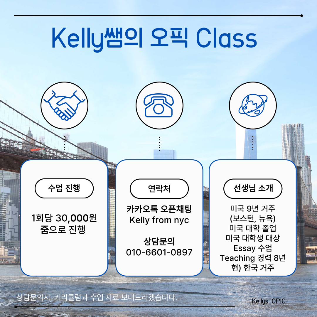 저는 뉴욕과 보스턴에서 약 9년간 생활하며 영어를 가르친 경험이 있어요. 미국 고등학생과 대학생 대상으로 영어 에세이 지도를 했고, 현재는 성인을 대상으로 OPIc(오픽) 코칭을 진행하고 있습니다.