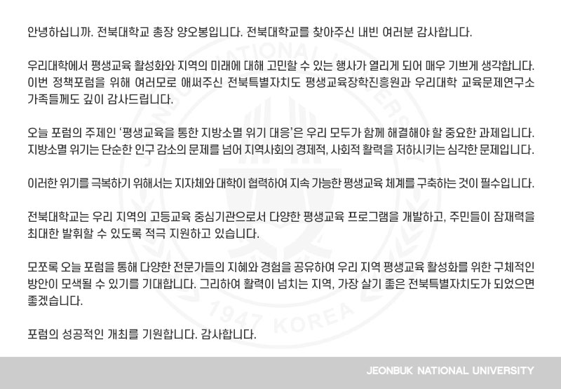 안녕하십니까. 전북대학교 총장 양오봉입니다. 전북대학교를 찾아주신 내빈 여러분 감사합니다. 우리대학에서 평생교육 활성화와 지역의 미래에 대해 고민할 수 있는 행사가 열리게 되어 매우 기쁘게 생각합니다. 이번 정책포럼을 위해 여러모로 애써주신 전북특별자치도 평생교육장학진흥원과 우리대학 교육문제연구소 가족들께도 깊이 감사드립니다. 오늘 포럼의 주제인 ‘평생교육을 통한 지방소멸 위기 대응’은 우리 모두가 함께 해결해야 할 중요한 과제입니다. 지방소멸 위기는 단순한 인구 감소의 문제를 넘어 지역사회의 경제적, 사회적 활력을 저하시키는 심각한 문제입니다. 이러한 위기를 극복하기 위해서는 지자체와 대학이 협력하여 지속 가능한 평생교육 체계를 구축하는 것이 필수입니다. 전북대학교는 우리 지역의 고등교육 중심기관으로서 다양한 평생교육 프로그램을 개발하고, 주민들이 잠재력을 최대한 발휘할 수 있도록 적극 지원하고 있습니다. 모쪼록 오늘 포럼을 통해 다양한 전문가들의 지혜와 경험을 공유하여 우리 지역 평생교육 활성화를 위한 구체적인 방안이 모색될 수 있기를 기대합니다. 그리하여 활력이 넘치는 지역, 가장 살기 좋은 전북특별자치도가 되었으면 좋겠습니다. 포럼의 성공적인 개최를 기원합니다. 감사합니다.
