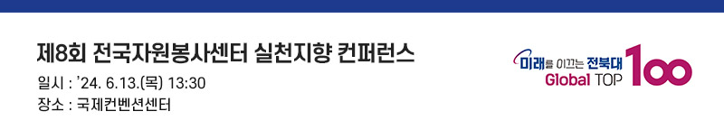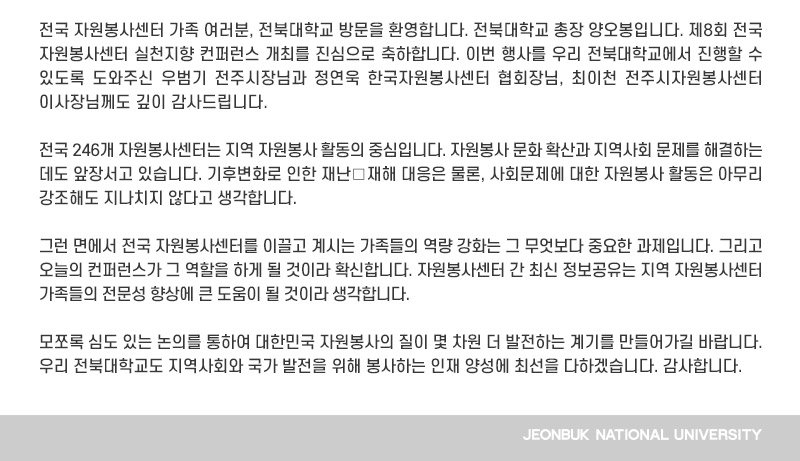 전국 자원봉사센터 가족 여러분, 전북대학교 방문을 환영합니다. 전북대학교 총장 양오봉입니다. 제8회 전국자원봉사센터 실천지향 컨퍼런스 개최를 진심으로 축하합니다. 이번 행사를 우리 전북대학교에서 진행할 수 있도록 도와주신 우범기 전주시장님과 정연욱 한국자원봉사센터 협회장님, 최이천 전주시자원봉사센터 이사장님께도 깊이 감사드립니다. 전국 246개 자원봉사센터는 지역 자원봉사 활동의 중심입니다. 자원봉사 문화 확산과 지역사회 문제를 해결하는 데도 앞장서고 있습니다. 기후변화로 인한 재난․재해 대응은 물론, 사회문제에 대한 자원봉사 활동은 아무리 강조해도 지나치지 않다고 생각합니다. 그런 면에서 전국 자원봉사센터를 이끌고 계시는 가족들의 역량 강화는 그 무엇보다 중요한 과제입니다. 그리고 오늘의 컨퍼런스가 그 역할을 하게 될 것이라 확신합니다. 자원봉사센터 간 최신 정보공유는 지역 자원봉사센터 가족들의 전문성 향상에 큰 도움이 될 것이라 생각합니다. 모쪼록 심도 있는 논의를 통하여 대한민국 자원봉사의 질이 몇 차원 더 발전하는 계기를 만들어가길 바랍니다. 우리 전북대학교도 지역사회와 국가 발전을 위해 봉사하는 인재 양성에 최선을 다하겠습니다. 감사합니다.