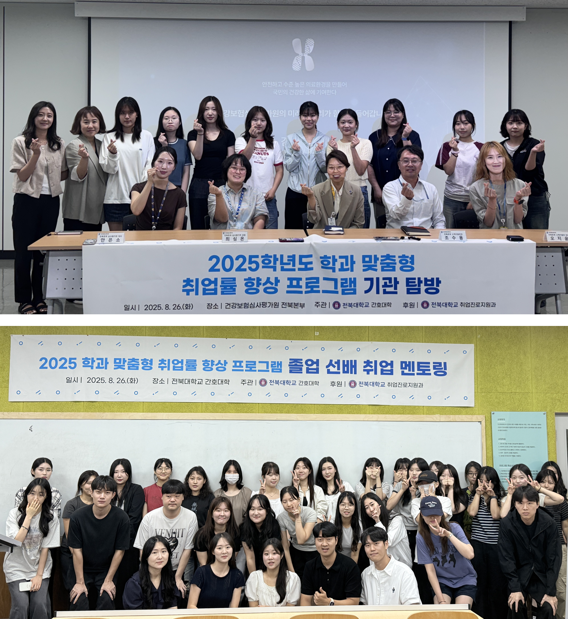 간호대학(학장 정석희)은 지난 8월 26일, 학과 맞춤형 취업률 향상 프로그램의 일환으로 건강보험심사평가원 전북본부 견학과 Big5 병원 취업 선배 멘토링을 실시했다. 이를 통해 학생들은 보건의료 현장을 직접 체험하고 다양한 취업 전략을 이해할 수 있는 기회를 가졌다.