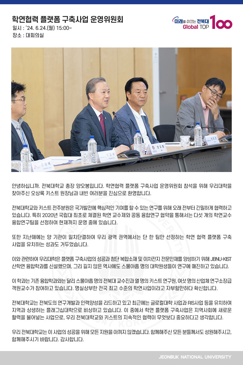 안녕하십니까. 전북대학교 총장 양오봉입니다. 학연협력 플랫폼 구축사업 운영위원회 참석을 위해 우리대학을 찾아주신 오상록 키스트 원장님과 내빈 여러분을 진심으로 환영합니다.