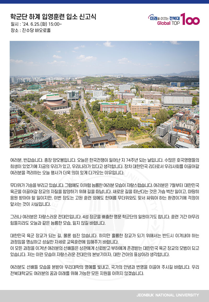 여러분, 반갑습니다. 총장 양오봉입니다. 오늘은 한국전쟁이 일어난 지 74주년 되는 날입니다. 수많은 호국영령들의 희생이 있었기에 지금의 우리가 있고, 우리나라가 있다고 생각합니다. 장차 대한민국 리더로서 우리사회를 이끌어갈 여러분을 격려하는 오늘 행사가 더욱 의미 있게 다가오는 이유입니다. 무더위가 기승을 부리고 있습니다. 그럼에도 이처럼 늠름한 여러분 모습이 자랑스럽습니다. 여러분은 7월부터 대한민국 육군을 이끌어갈 장교의 자질을 함양하기 위해 길을 떠납니다. 새로운 길을 떠난다는 것은 가슴 벅찬 일이고, 마땅히 응원 받아야 할 일이지만, 이번 장도는 고된 훈련 외에도 한여름 무더위와도 맞서 싸워야 하는 환경이기에 걱정이 앞서는 것이 사실입니다. 그러나 여러분은 자랑스러운 전대인입니다. 4성 장군을 배출한 명문 학군단의 일원이기도 합니다. 훈련 기간 아무리 힘들지라도 오늘과 같은 늠름한 모습, 잃지 않길 바랍니다. 대한민국 육군 장교가 되는 길, 물론 쉽진 않습니다. 하지만 훌륭한 장교가 되기 위해서는 반드시 이겨내야 하는 과정임을 명심하고 성실한 자세로 교육훈련에 임해주기 바랍니다. 이 모든 과정을 이겨낸 여러분의 선배들은 상관에게 신뢰받고 부하에게 존경받는 대한민국 육군 장교의 모범이 되고 있습니다. 저는 이런 모습이 자랑스러운 전대인의 본보기이자, 대한 건아의 표상이라 생각합니다. 여러분도 선배들 모습을 본받아 우리대학의 명예를 빛내고, 국가의 안녕과 번영을 이끌어 주시길 바랍니다. 우리 전북대학교도 여러분의 꿈과 미래를 위해 가능한 모든 지원을 아끼지 않겠습니다.